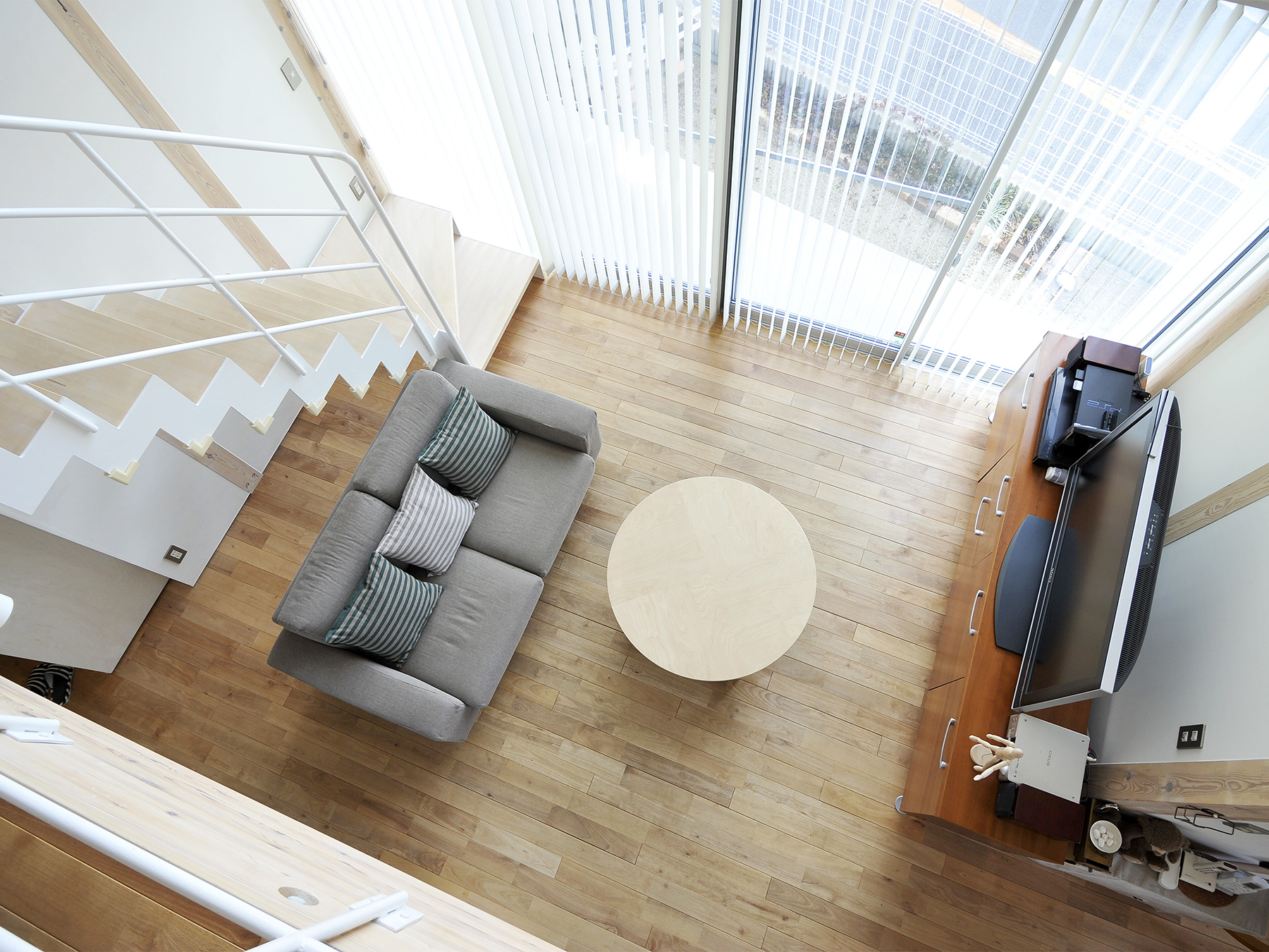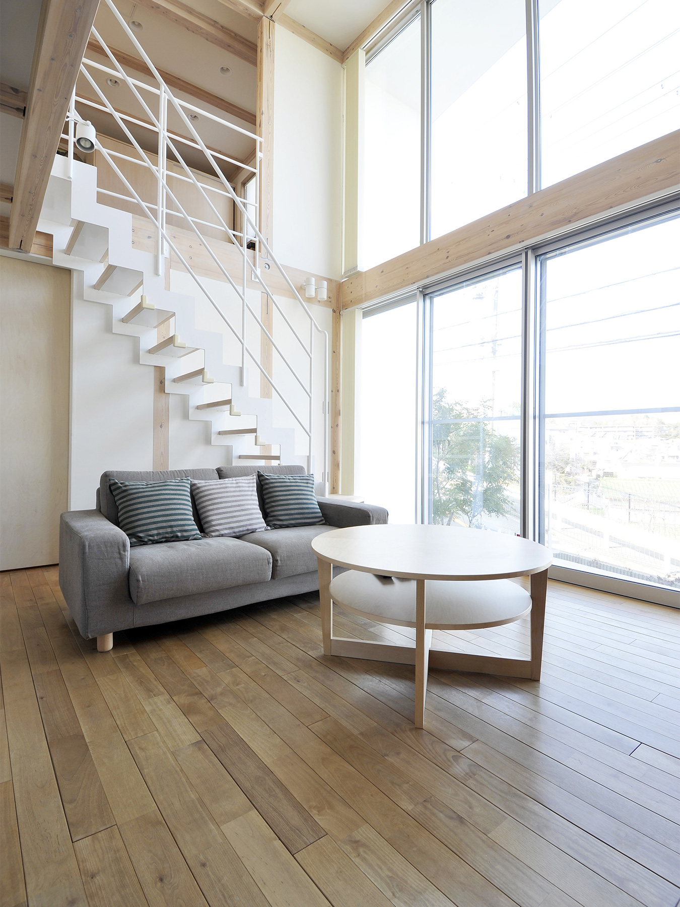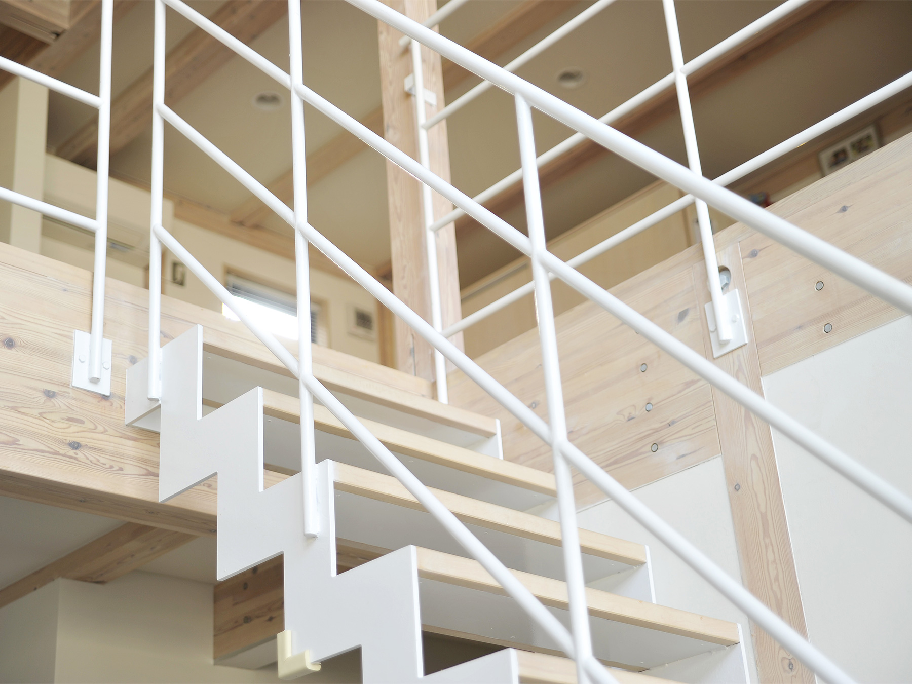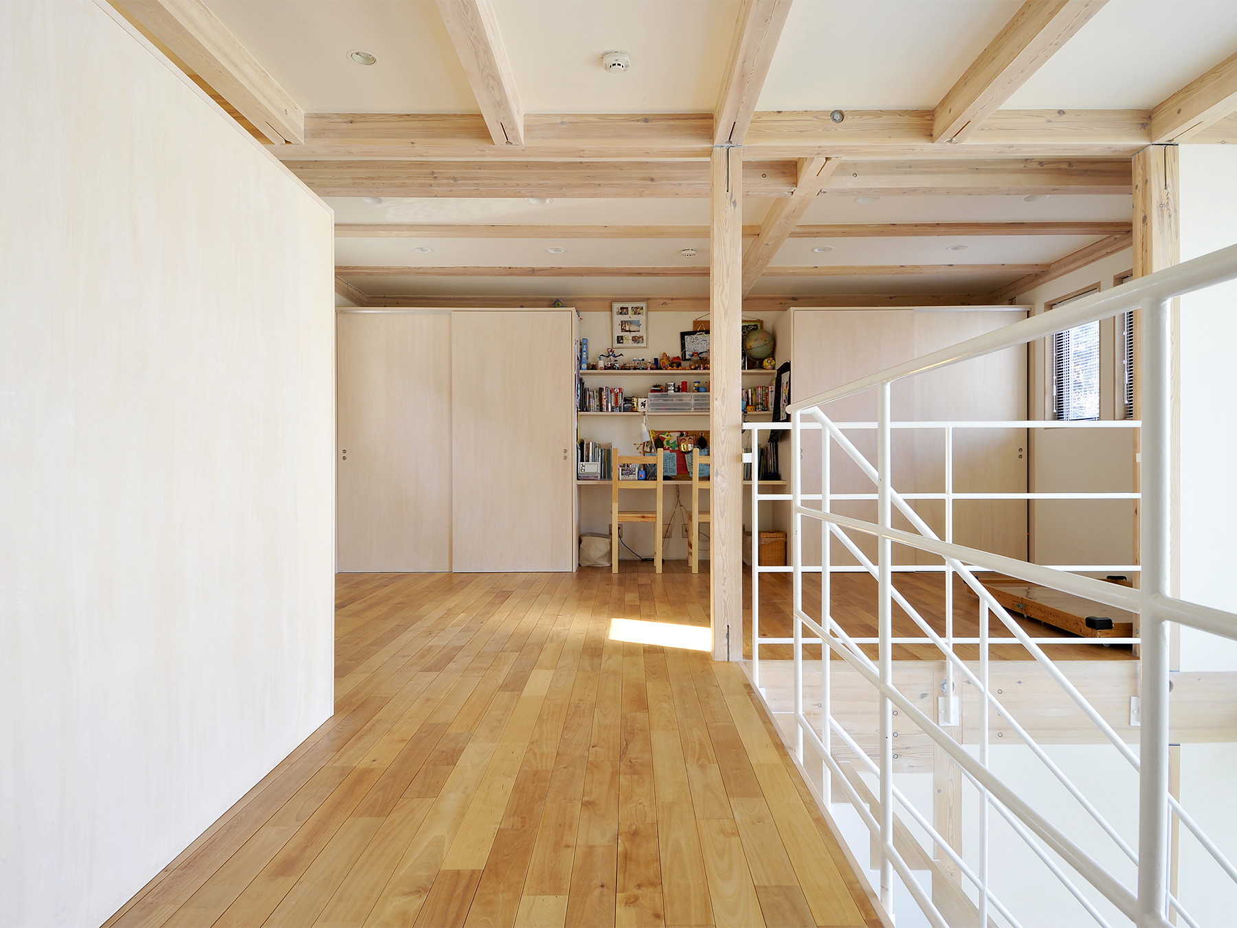 家を建てると決めてから、多くのハウスメーカーや工務店を訪ねてまわられたE様ご夫婦。ところがどこへ行っても、自分たちのイメージが伝わらなかったり、不明瞭な見積りに納得がいかなかったりと悩んでおられた時の出会いでした。「無印良品の家」がお好きとの事で、近いイメージを心掛けてご提案しました。SE構法の構造体の美しさを気に入られ、梁や柱をそのまま見せるデザインに。せっかく見せるのならばと、梁の寸法を揃えたりしながら設計を進めました。大きな吹抜けを中心として家全体がひとつの空間になっているので、家族どうし、お互いの気配を感じながら暮らしていただけます。