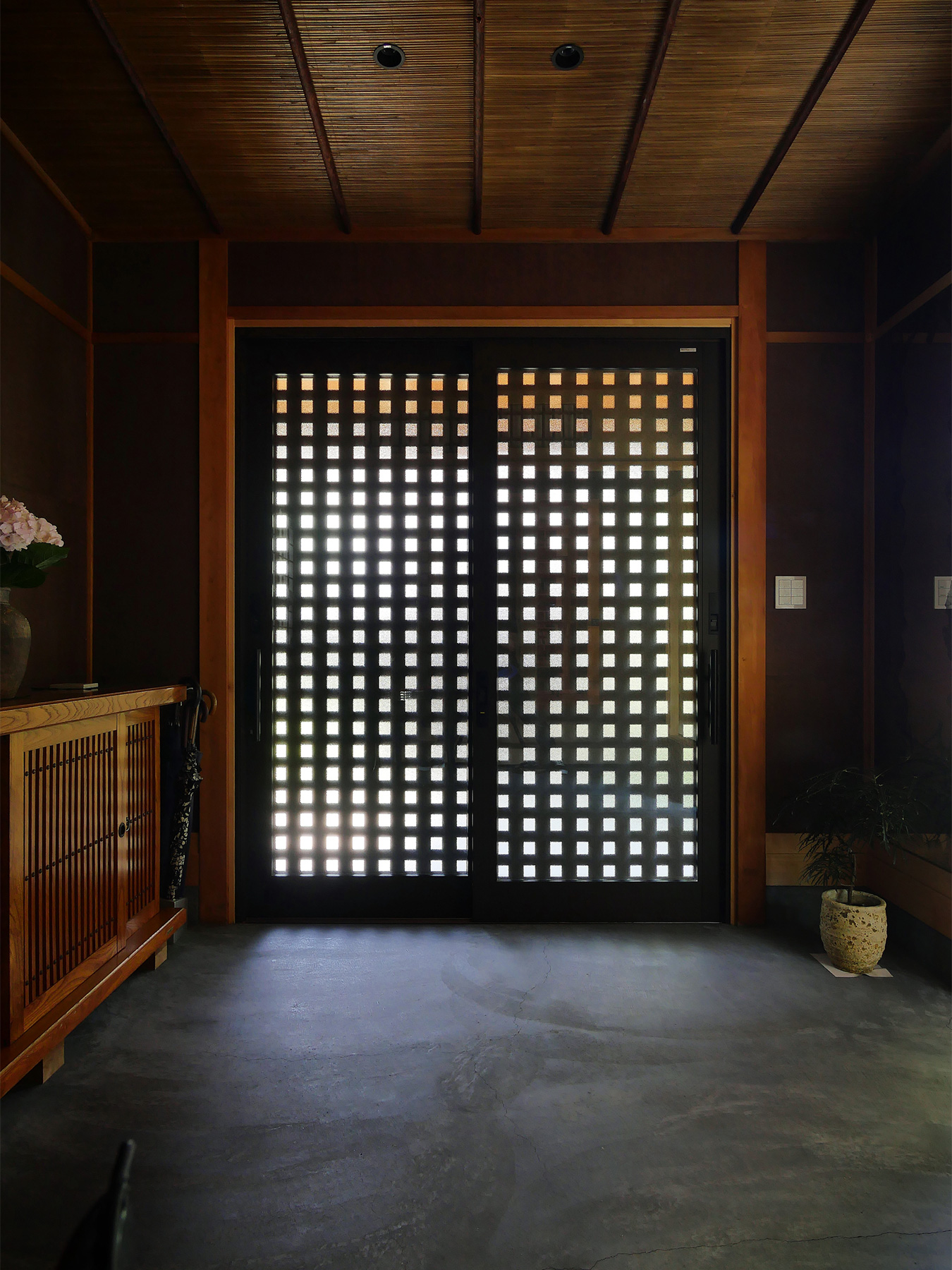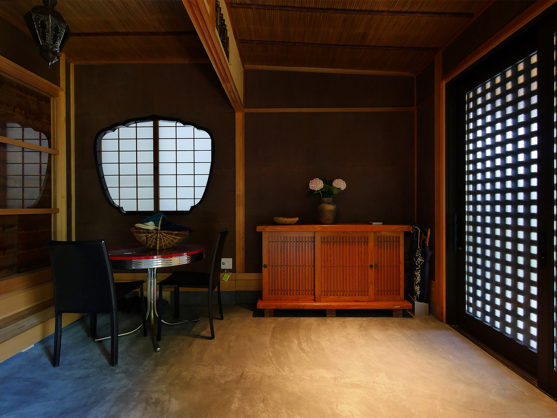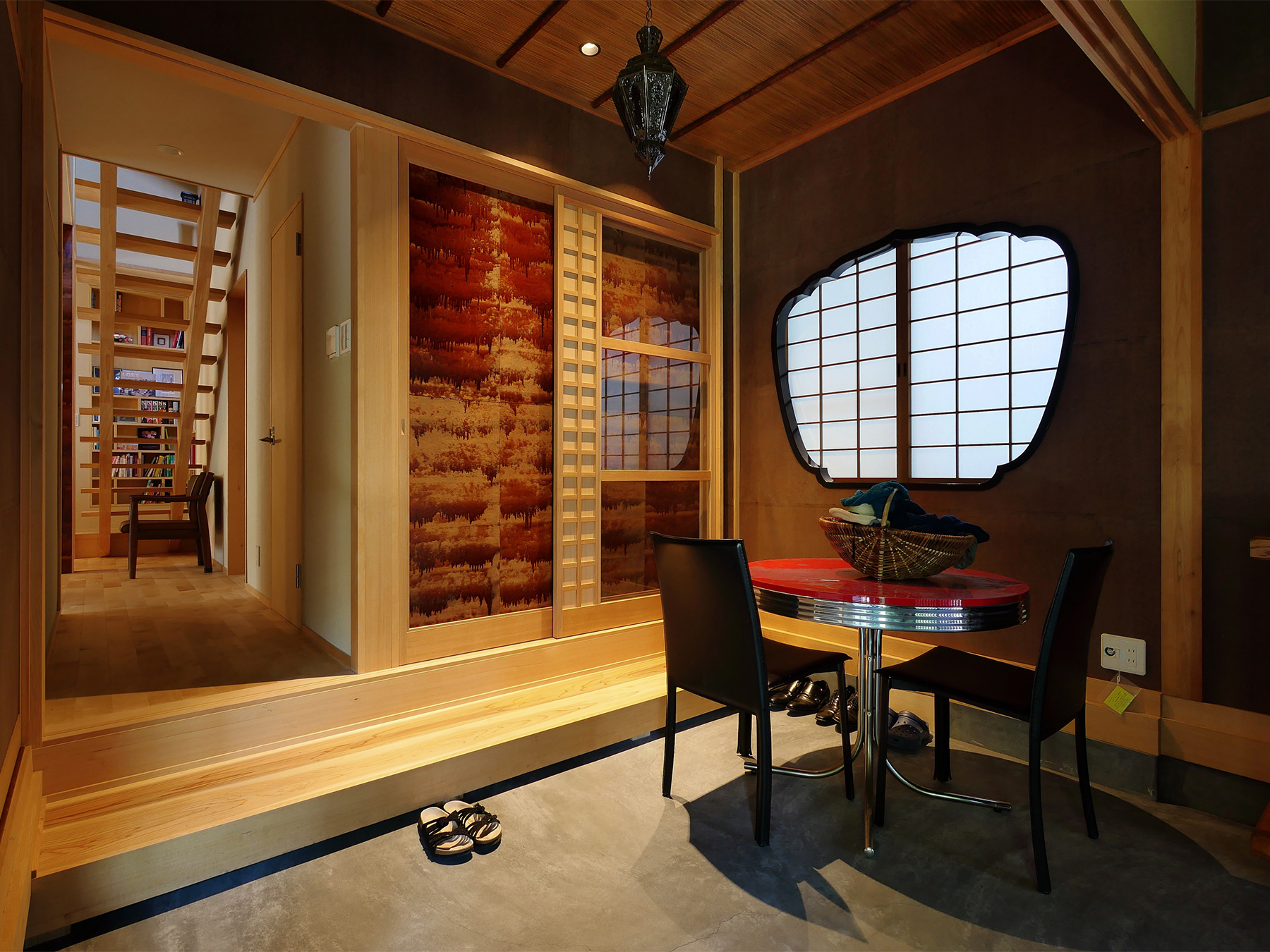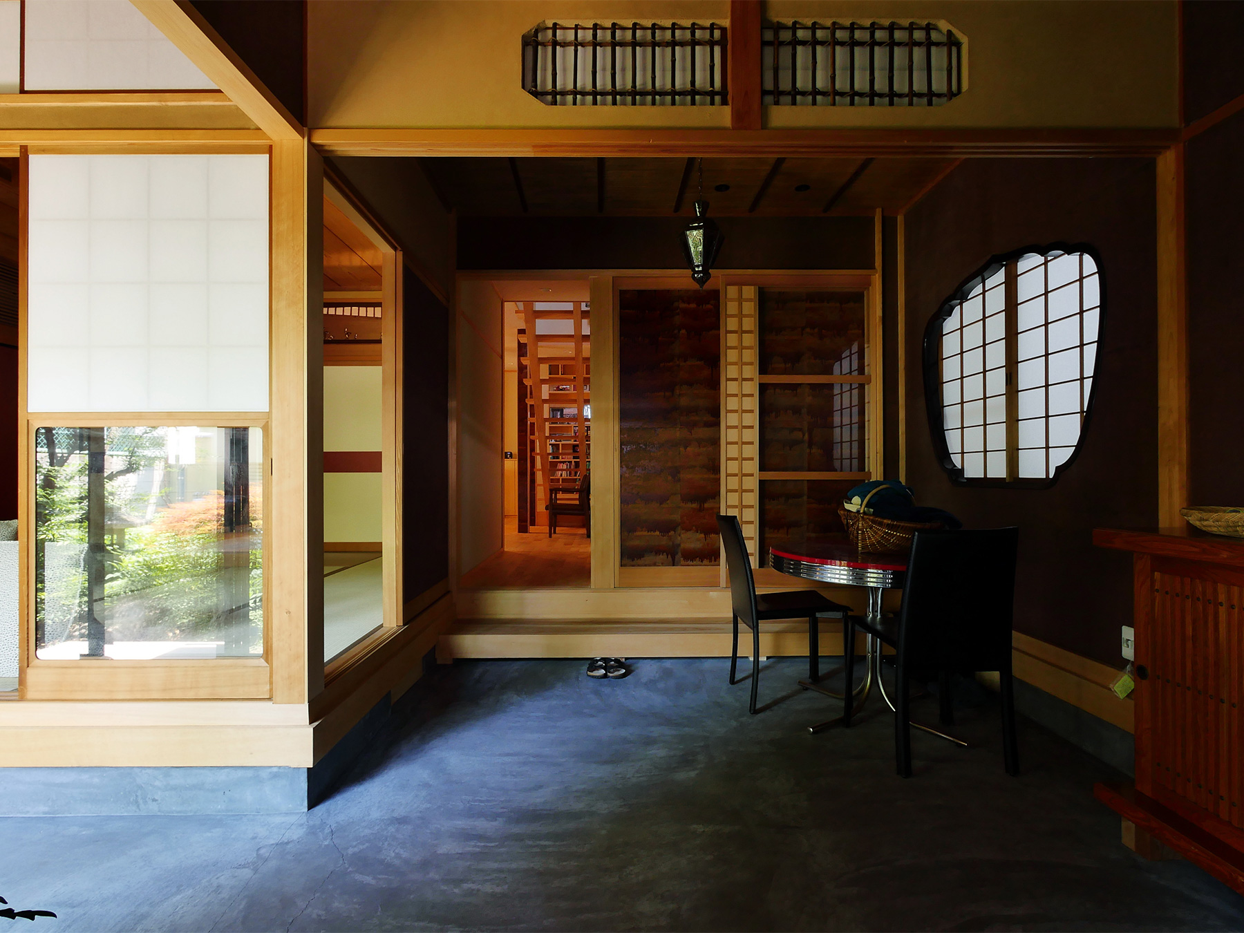 海外からのゲストの多いお施主様から、京都らしい風情を出してほしいとのご依頼を頂きました。 日本家屋らしい陰影のある空間は、数寄屋や土間などの純和風の要素と、鮮やかな漆紙や竹天井などのオリエンタルな設いによって、その奥ゆかしさを随所に感じさせます。
