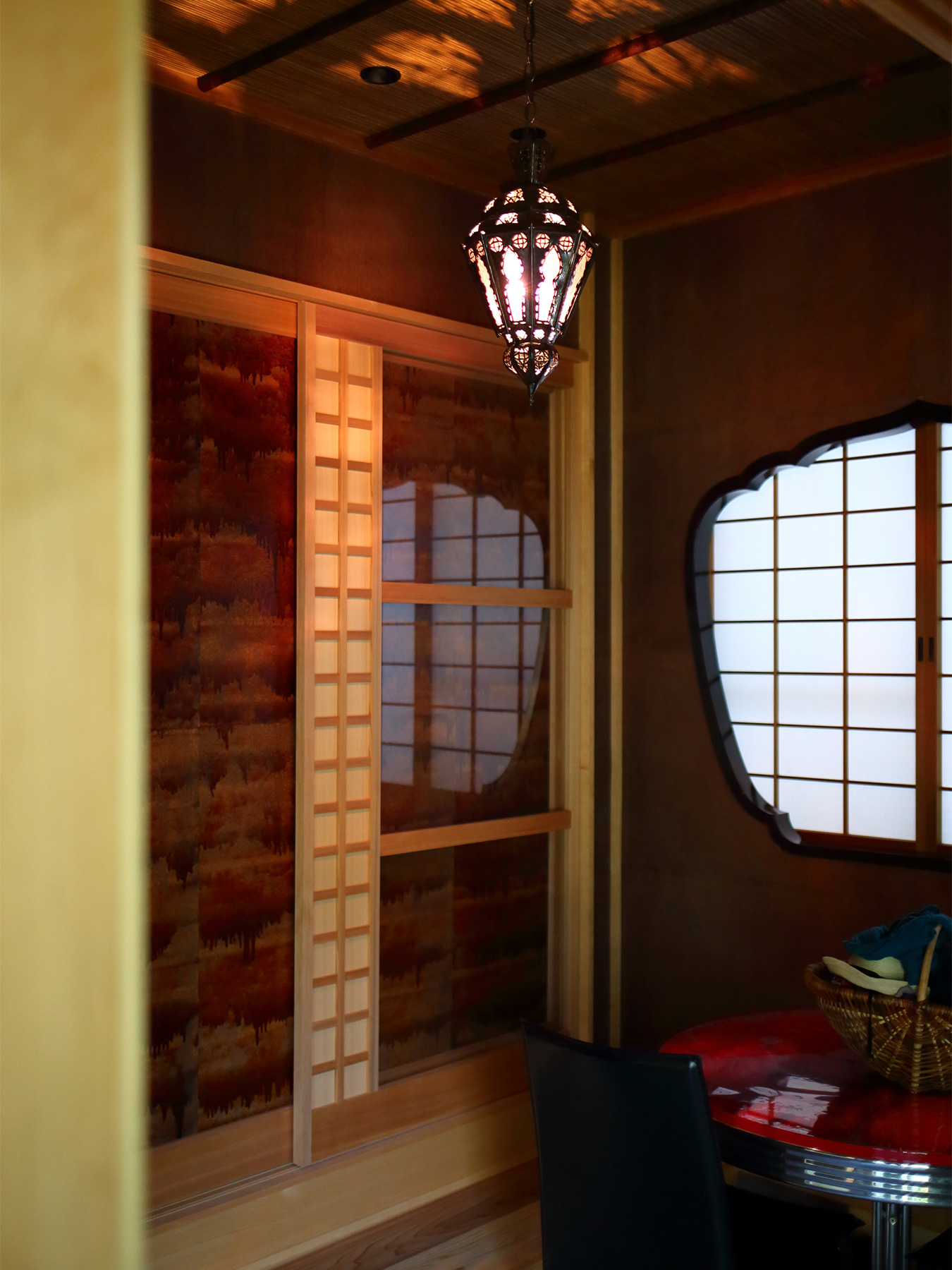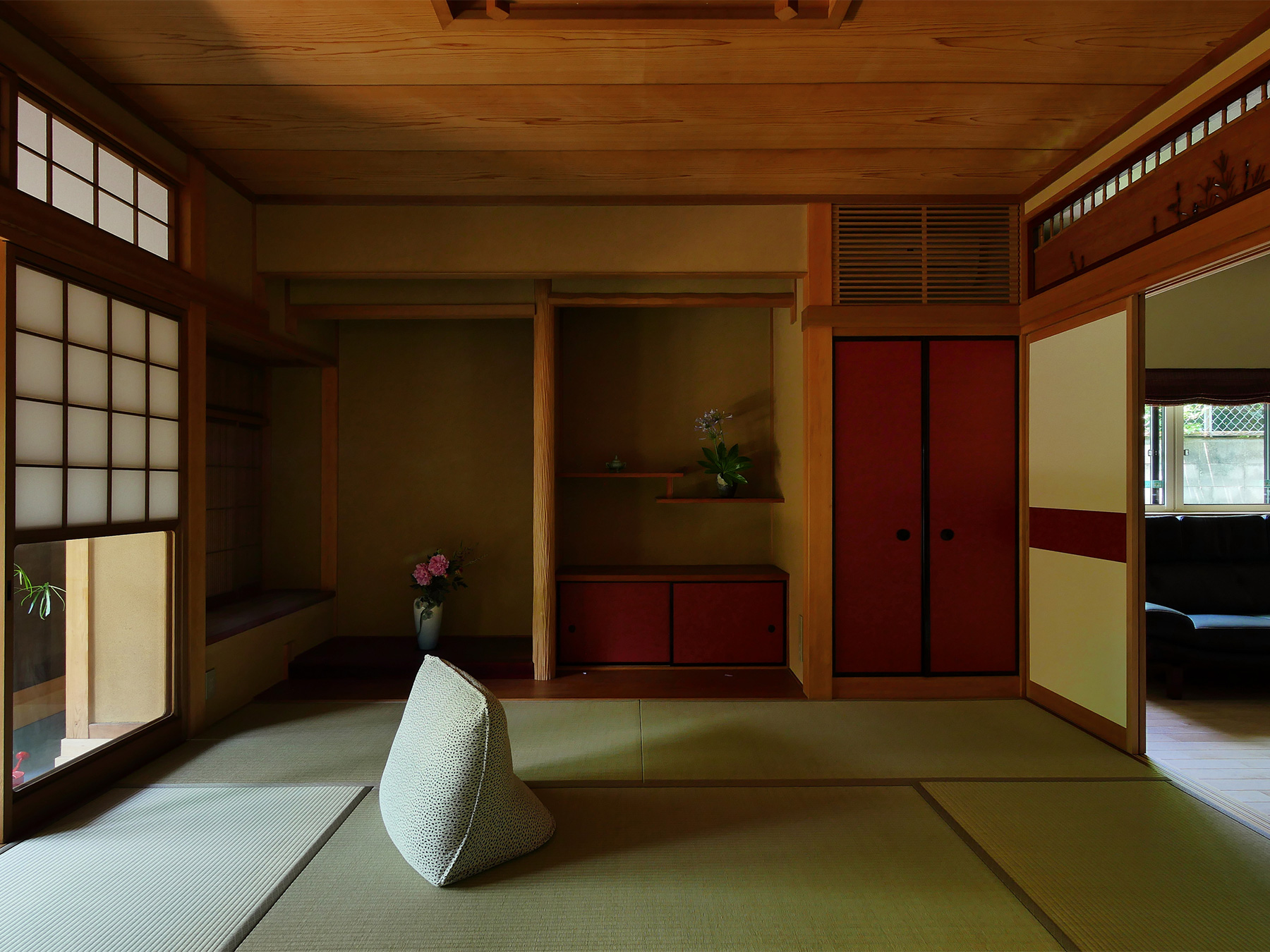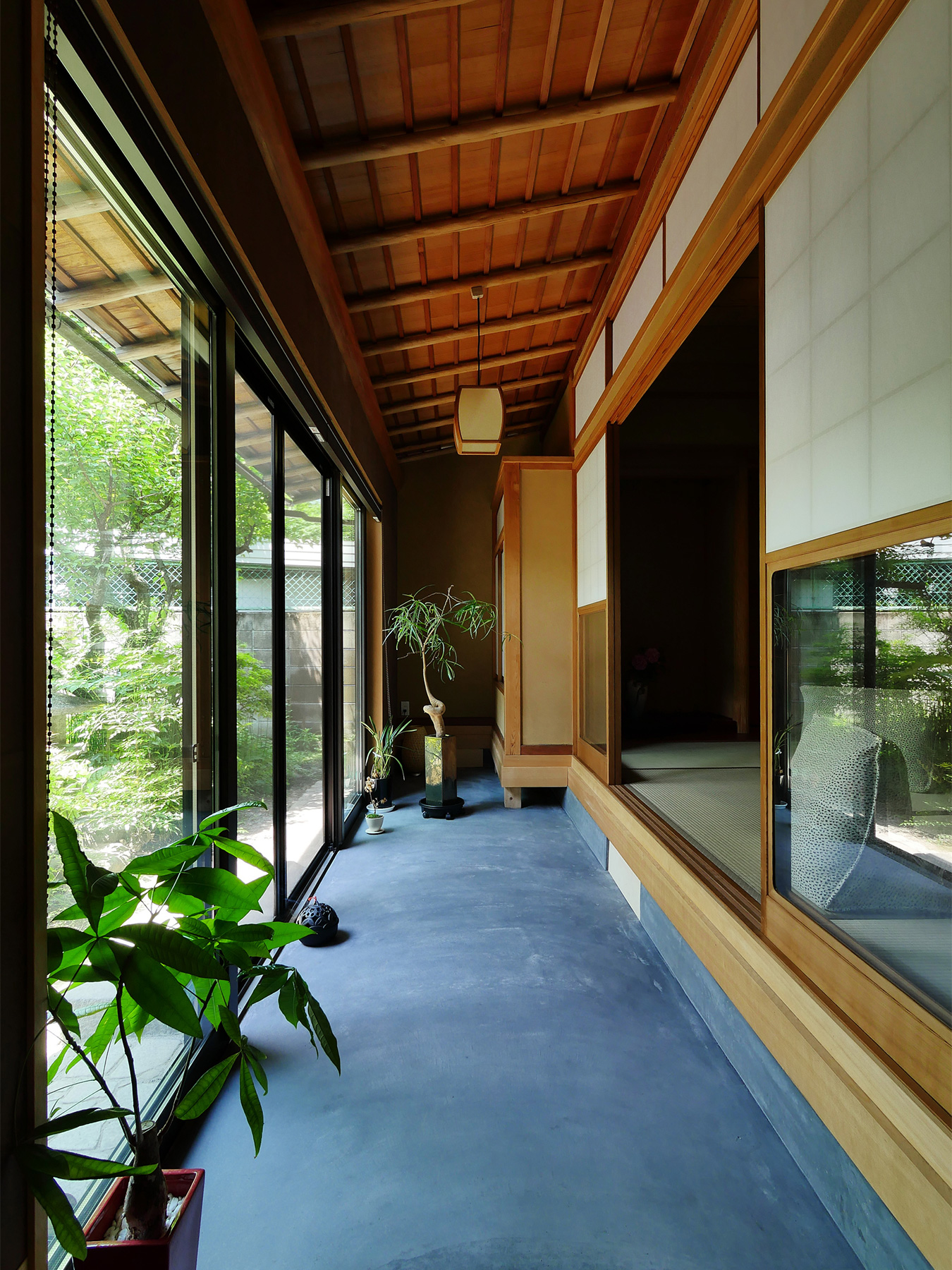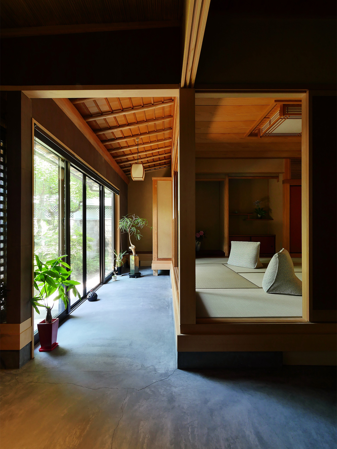 海外からのゲストの多いお施主様から、京都らしい風情を出してほしいとのご依頼を頂きました。 日本家屋らしい陰影のある空間は、数寄屋や土間などの純和風の要素と、鮮やかな漆紙や竹天井などのオリエンタルな設いによって、その奥ゆかしさを随所に感じさせます。