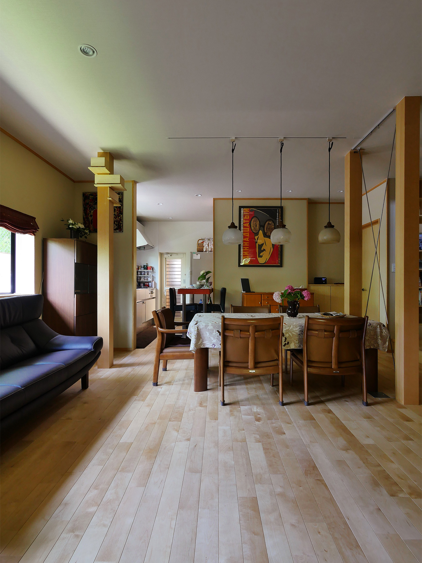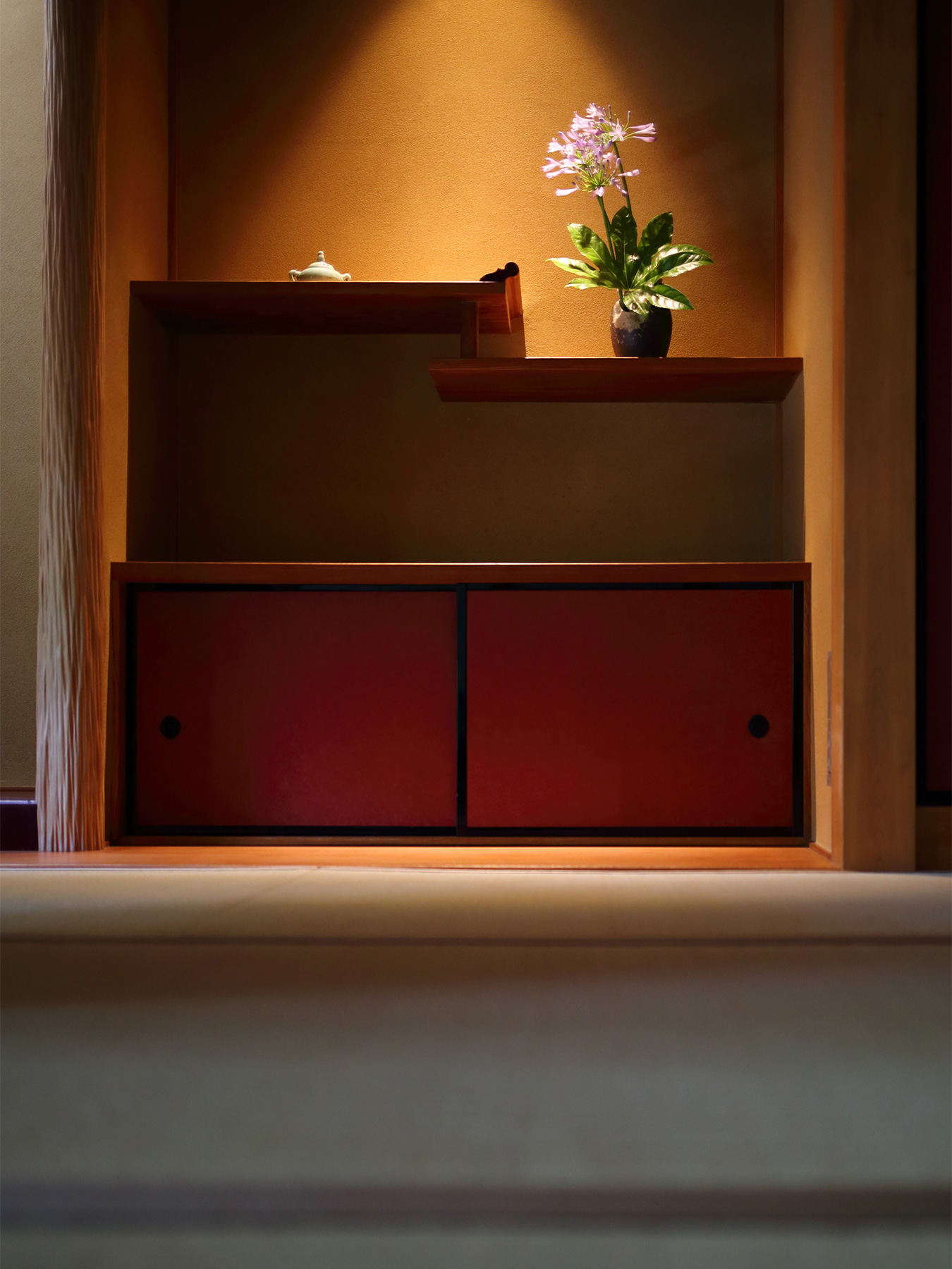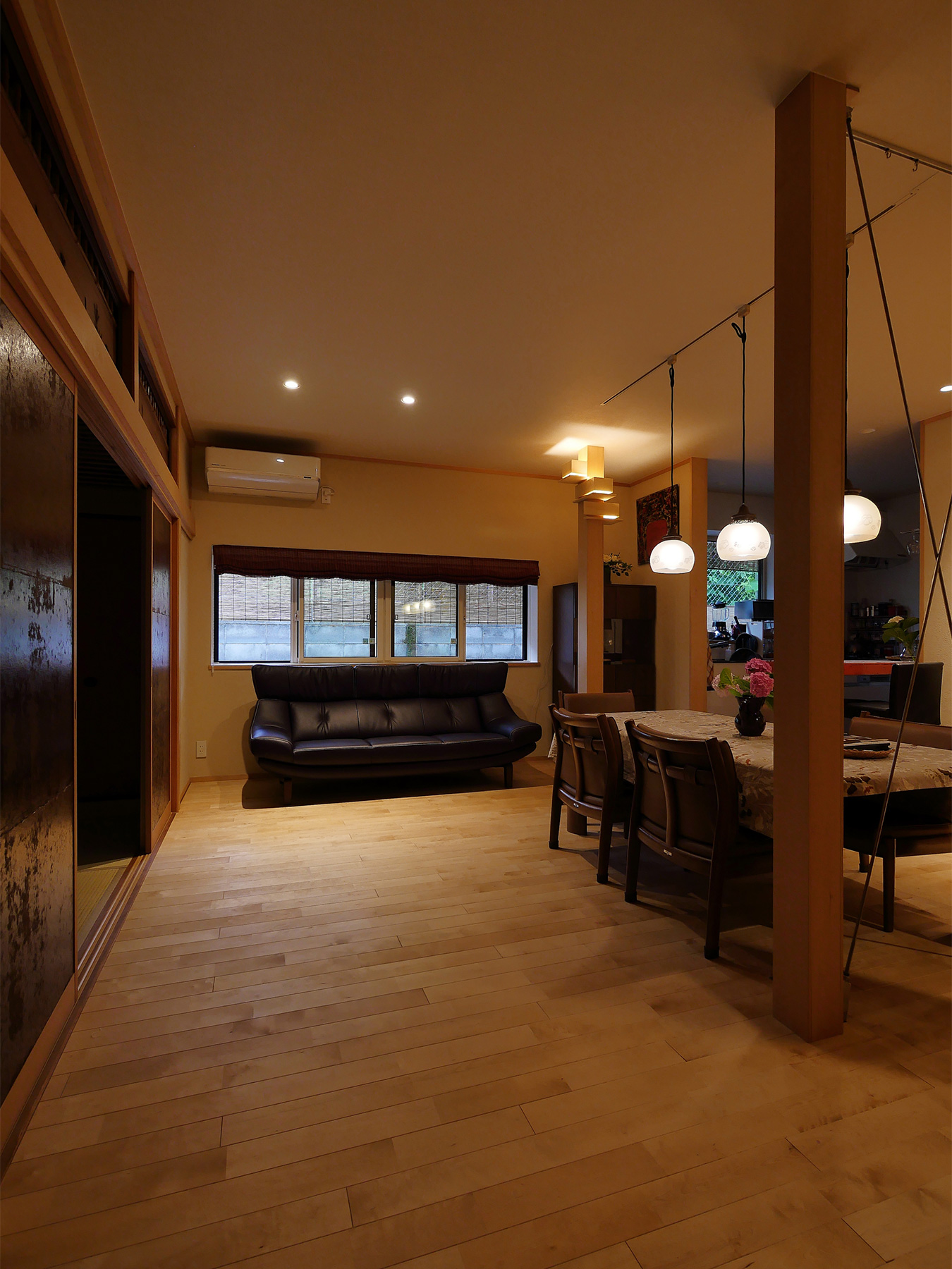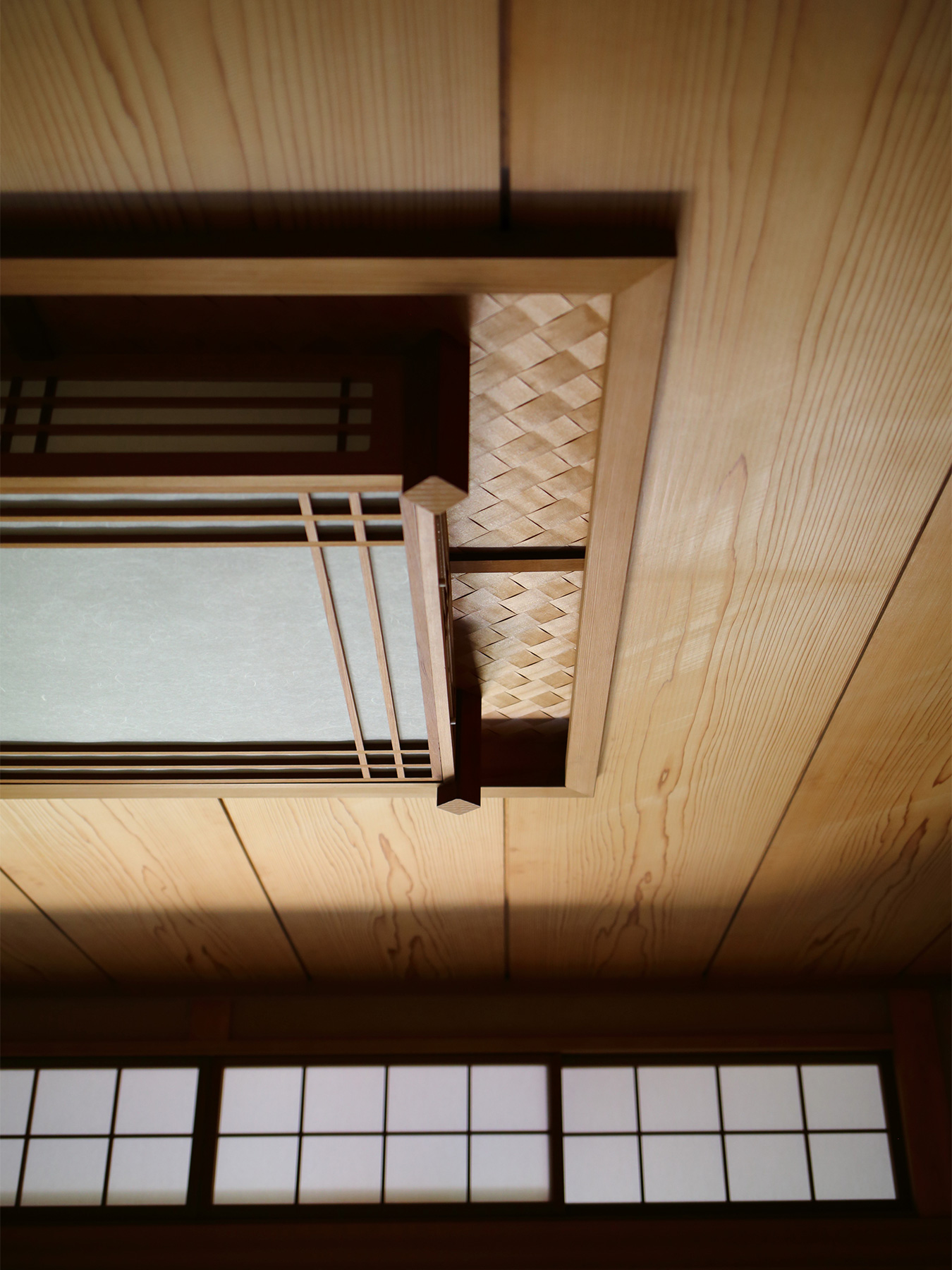 海外からのゲストの多いお施主様から、京都らしい風情を出してほしいとのご依頼を頂きました。 日本家屋らしい陰影のある空間は、数寄屋や土間などの純和風の要素と、鮮やかな漆紙や竹天井などのオリエンタルな設いによって、その奥ゆかしさを随所に感じさせます。