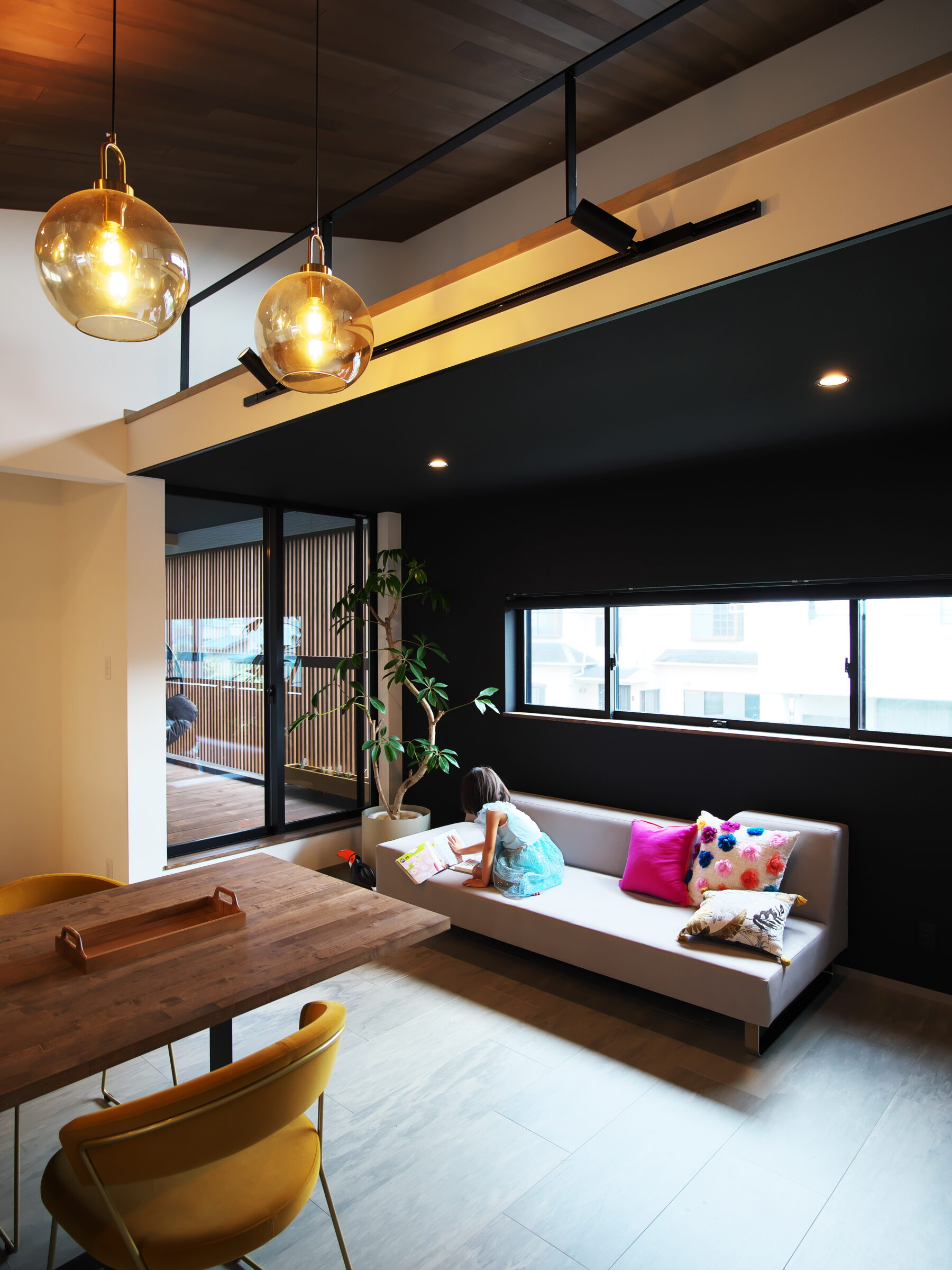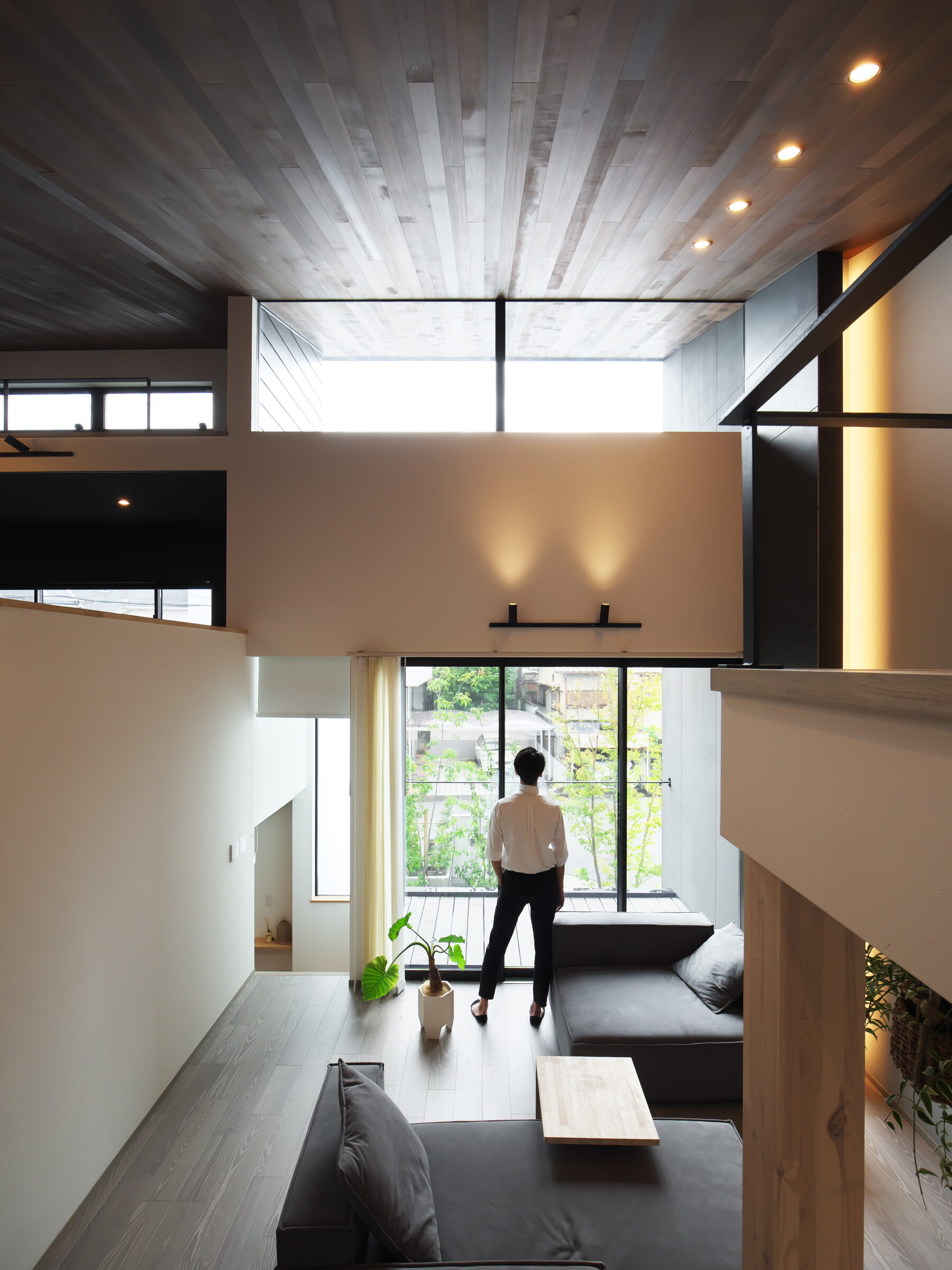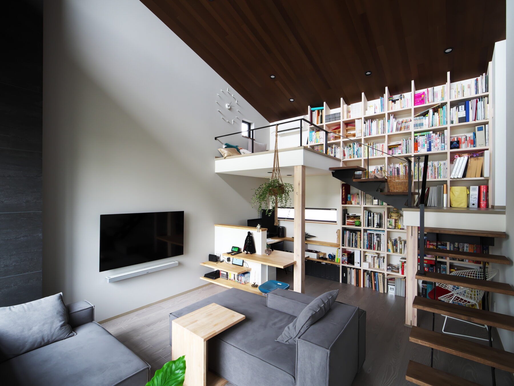 中2階Lと2階DKと各ロフトはおおらかに区切られた空間でありながら段差もあるので、家族がそれぞれ集中しつつもお互いに気配を感じることができます。中2階の大開口では壁や勾配天井を外まで伸ばすことでより開放感があります。
