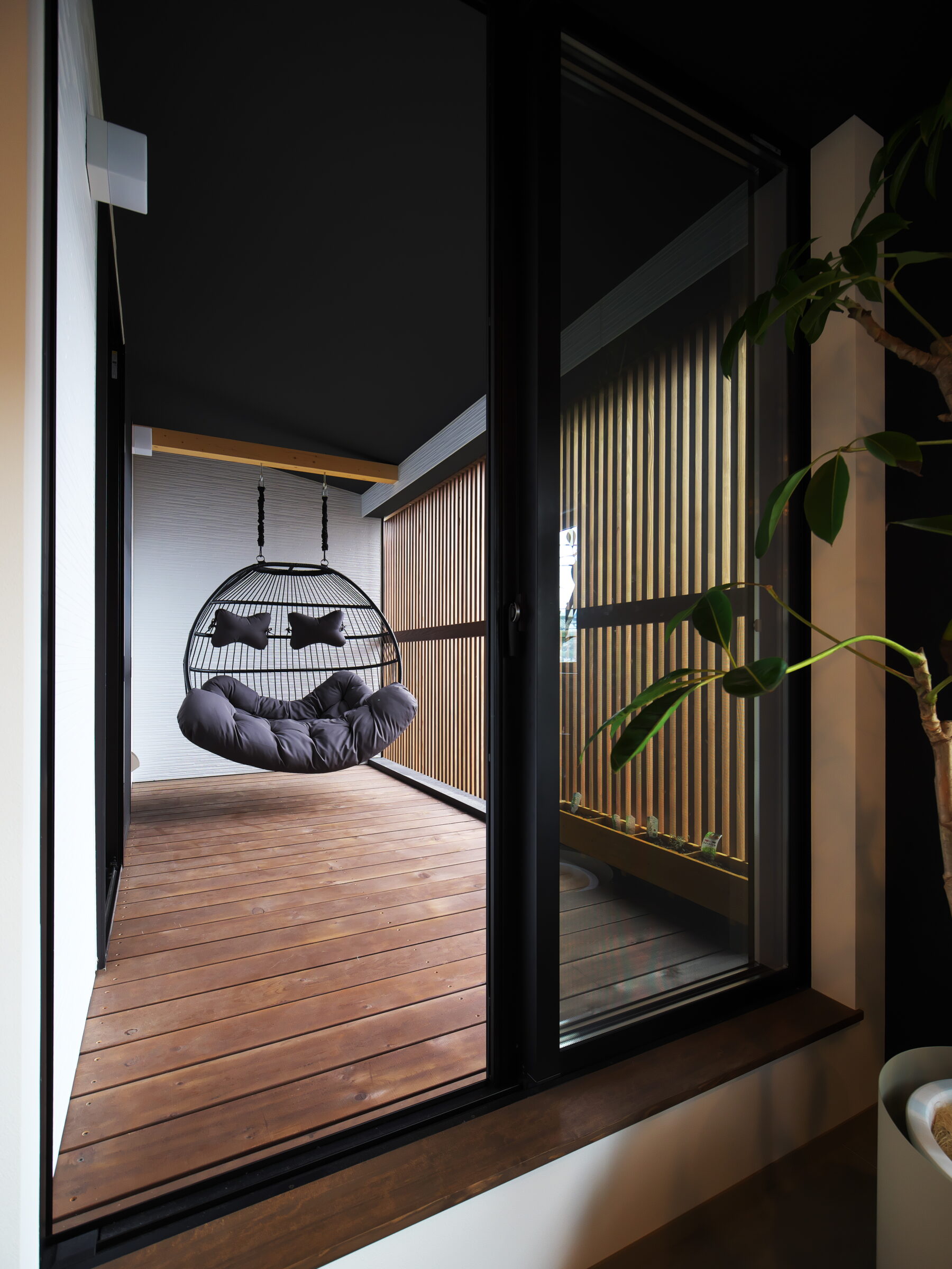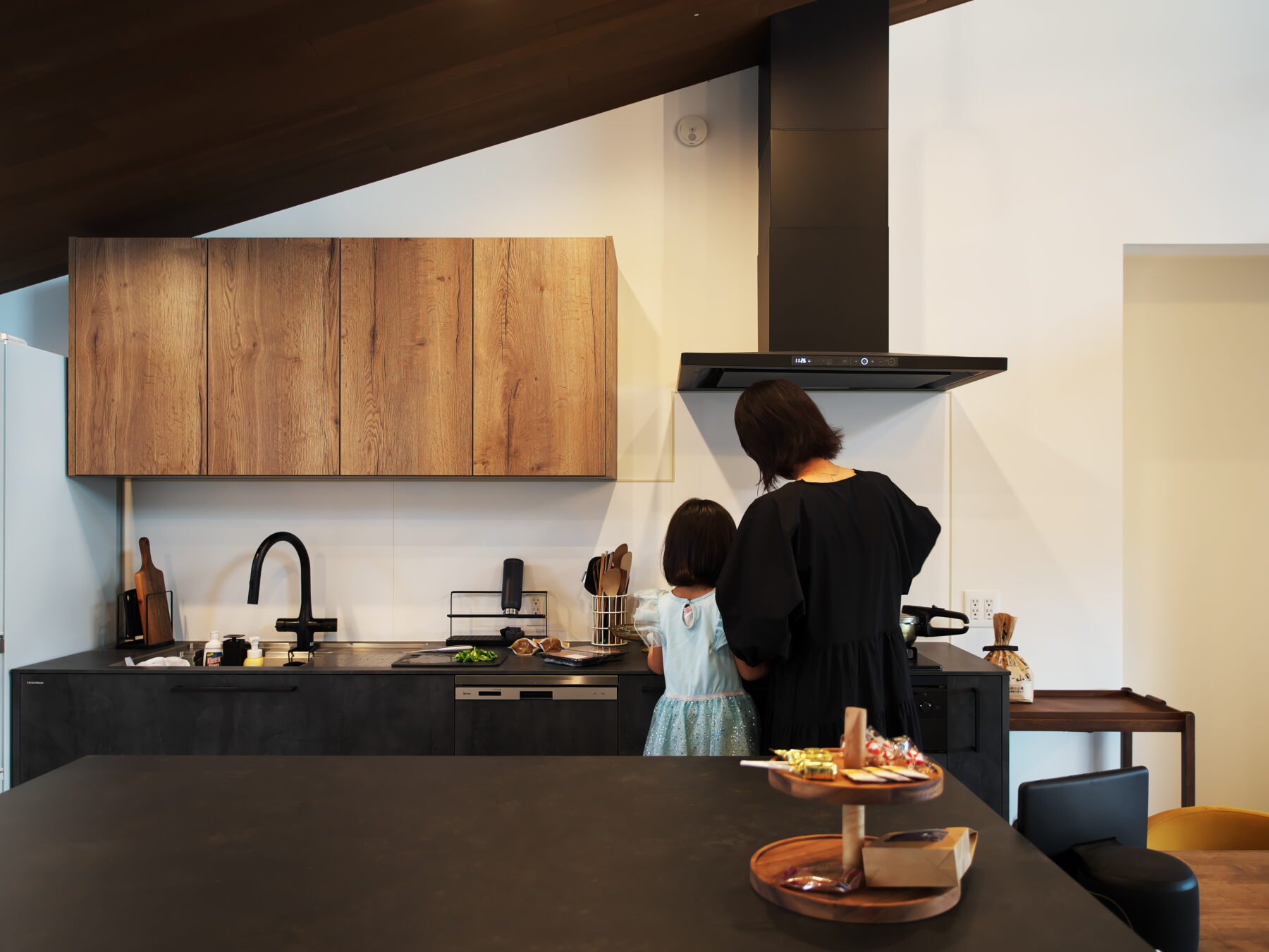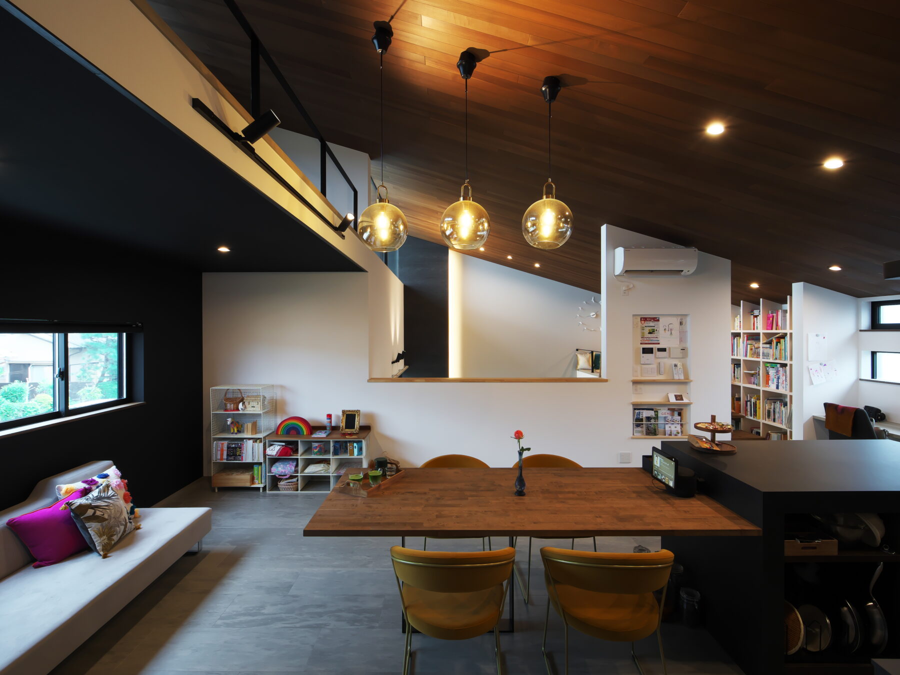 中2階Lと2階DKと各ロフトはおおらかに区切られた空間でありながら段差もあるので、家族がそれぞれ集中しつつもお互いに気配を感じることができます。中2階の大開口では壁や勾配天井を外まで伸ばすことでより開放感があります。