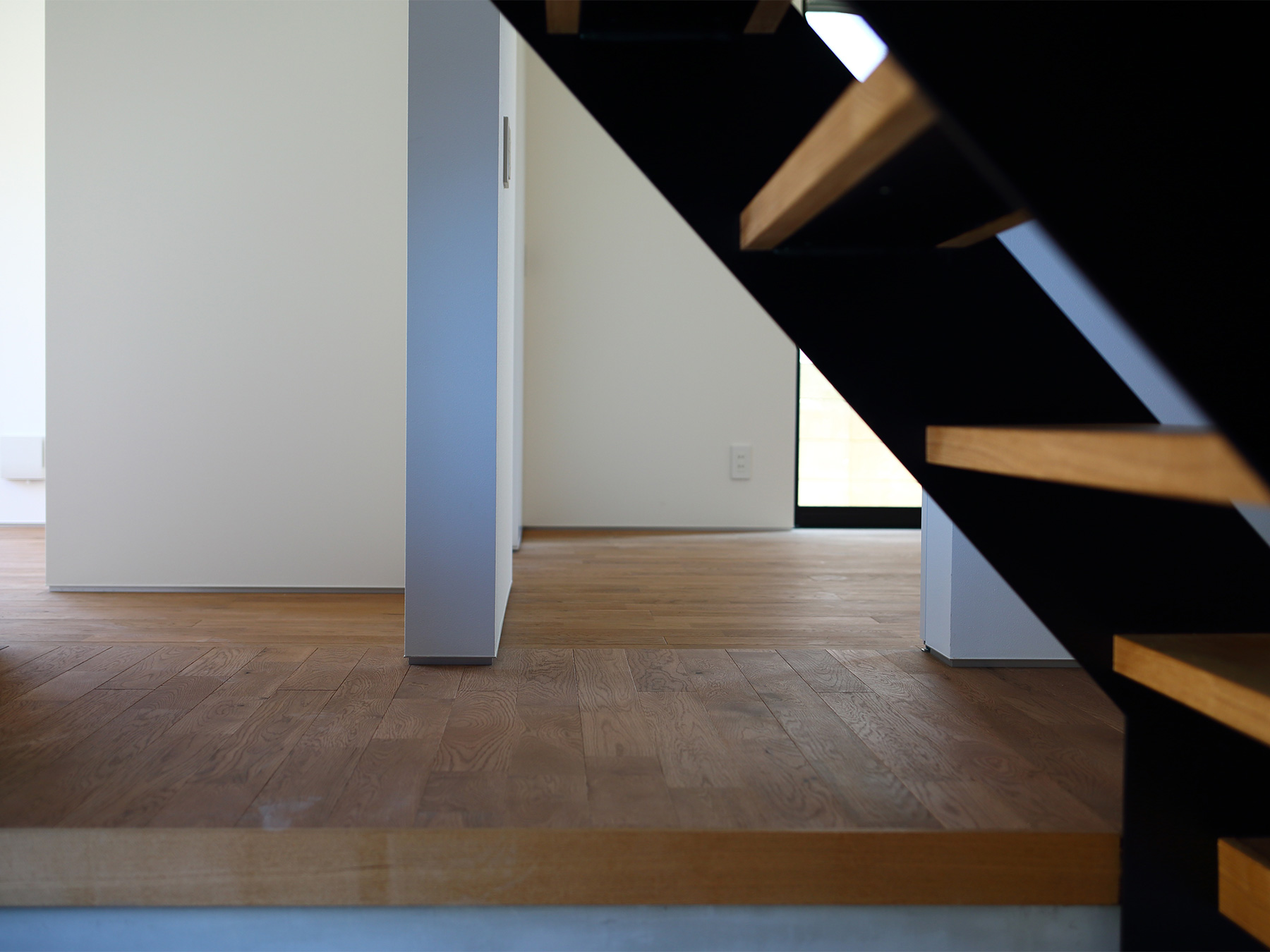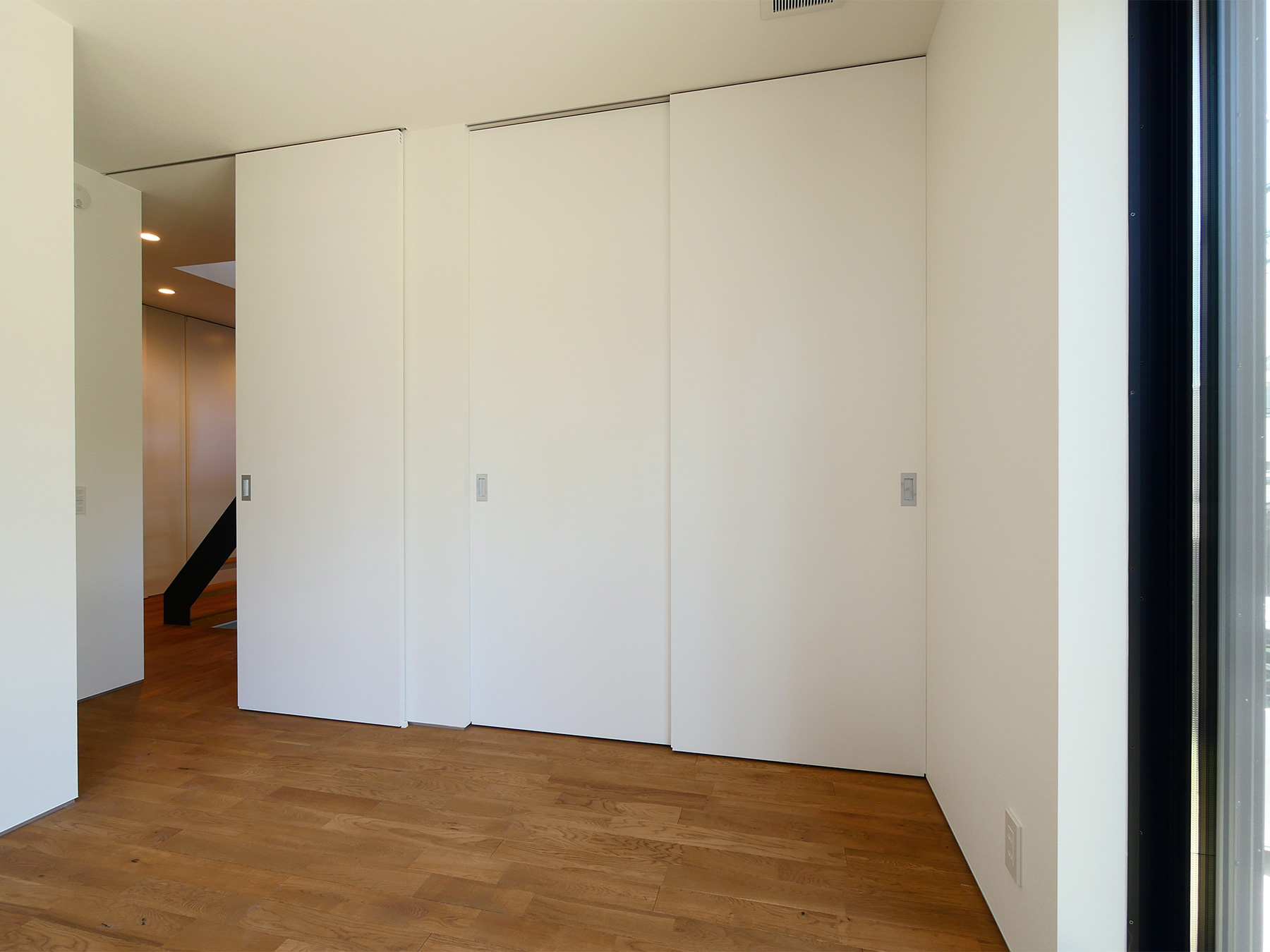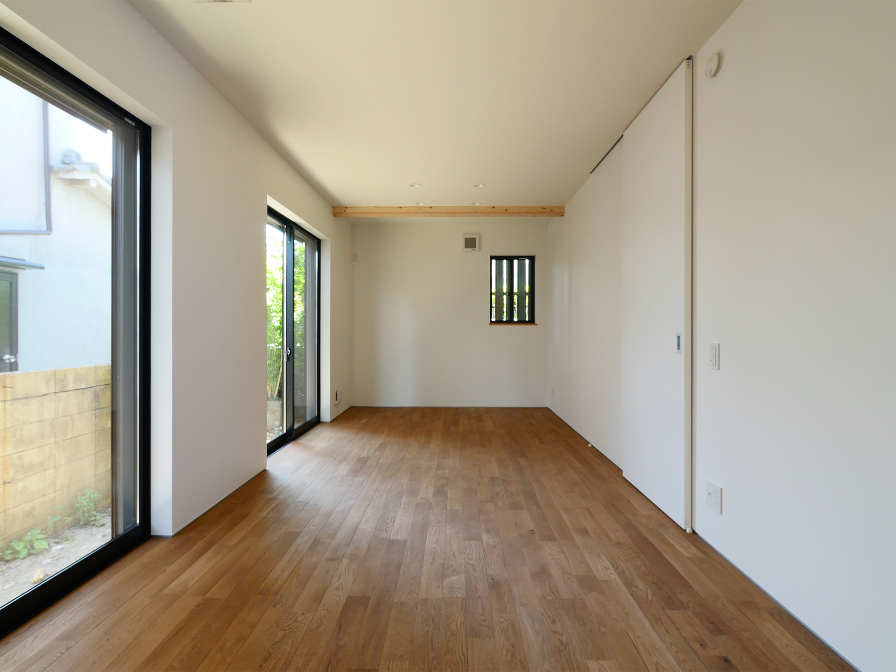 居室のみならずクローゼットまで贅沢に敷き詰めた無垢材の床は、足元に一切仕切りを作らずに全室シームレスつながっています。構造は京都の住まいに最適な耐震構法SE構法。1階の寝室は将来的な部屋割りも視野に入れ、SE構法の特徴である柱が少なくスパンの長い設計です。