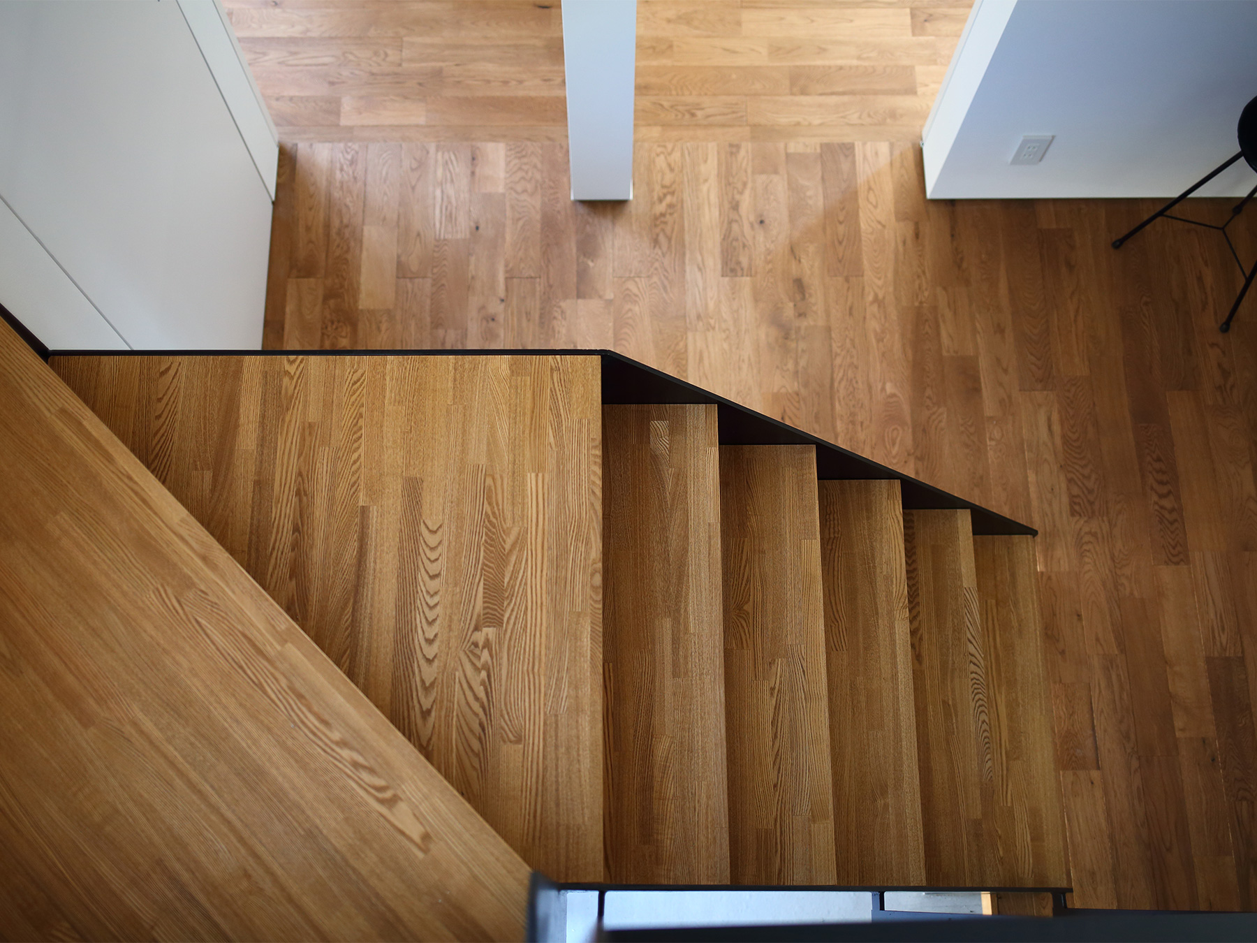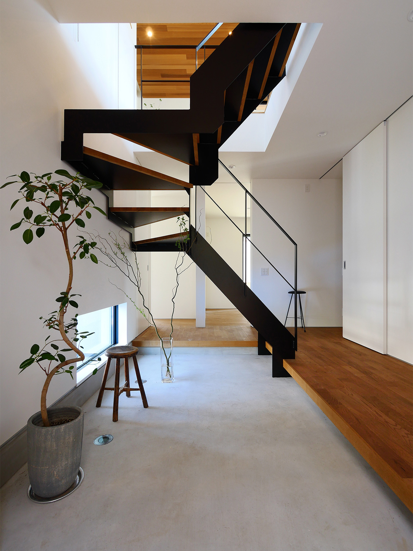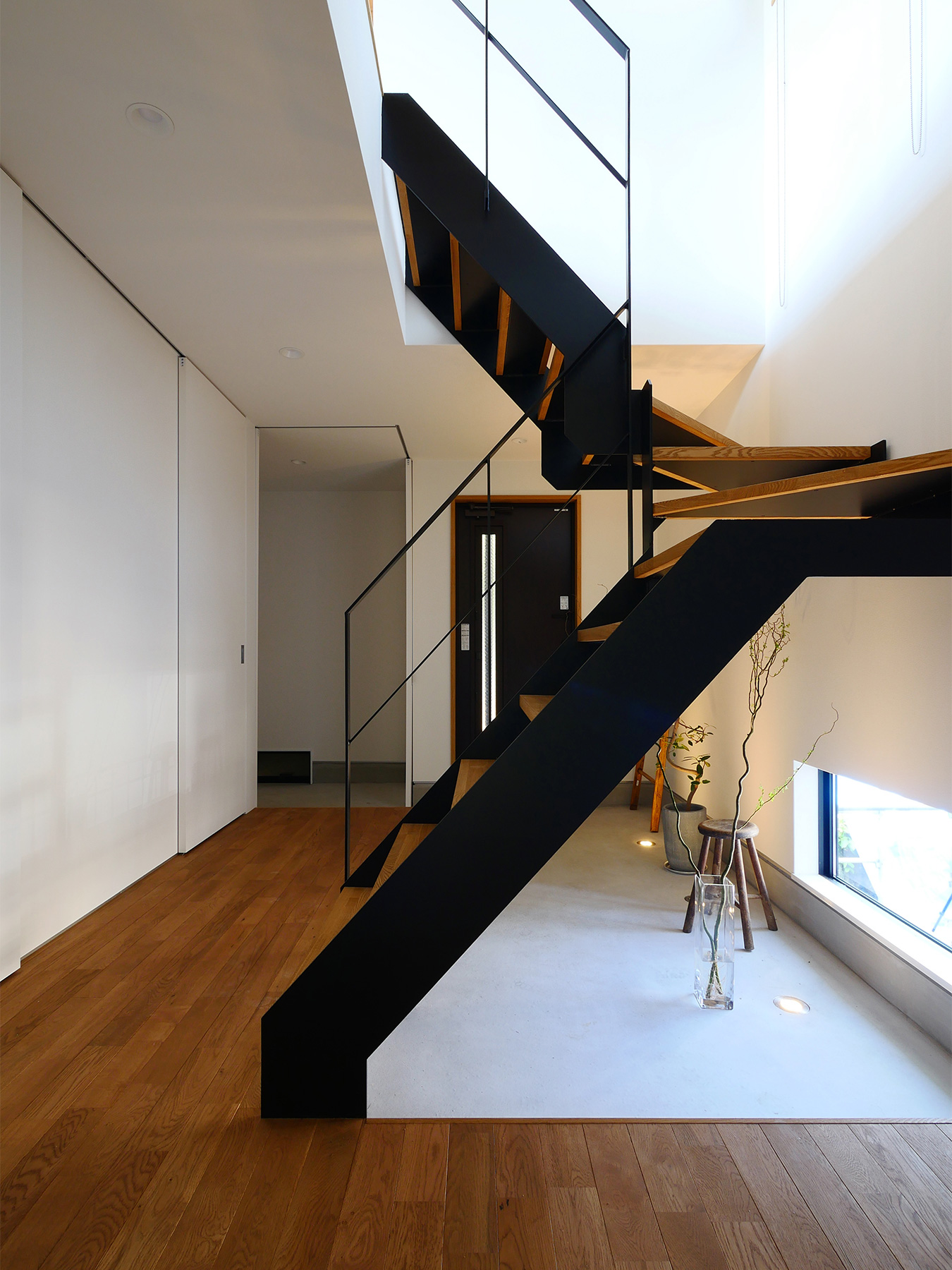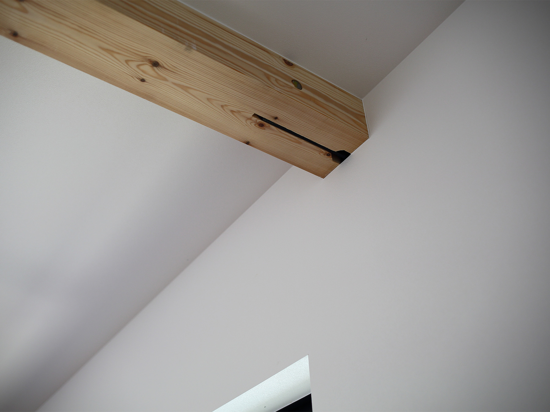 居室のみならずクローゼットまで贅沢に敷き詰めた無垢材の床は、足元に一切仕切りを作らずに全室シームレスつながっています。構造は京都の住まいに最適な耐震構法SE構法。1階の寝室は将来的な部屋割りも視野に入れ、SE構法の特徴である柱が少なくスパンの長い設計です。