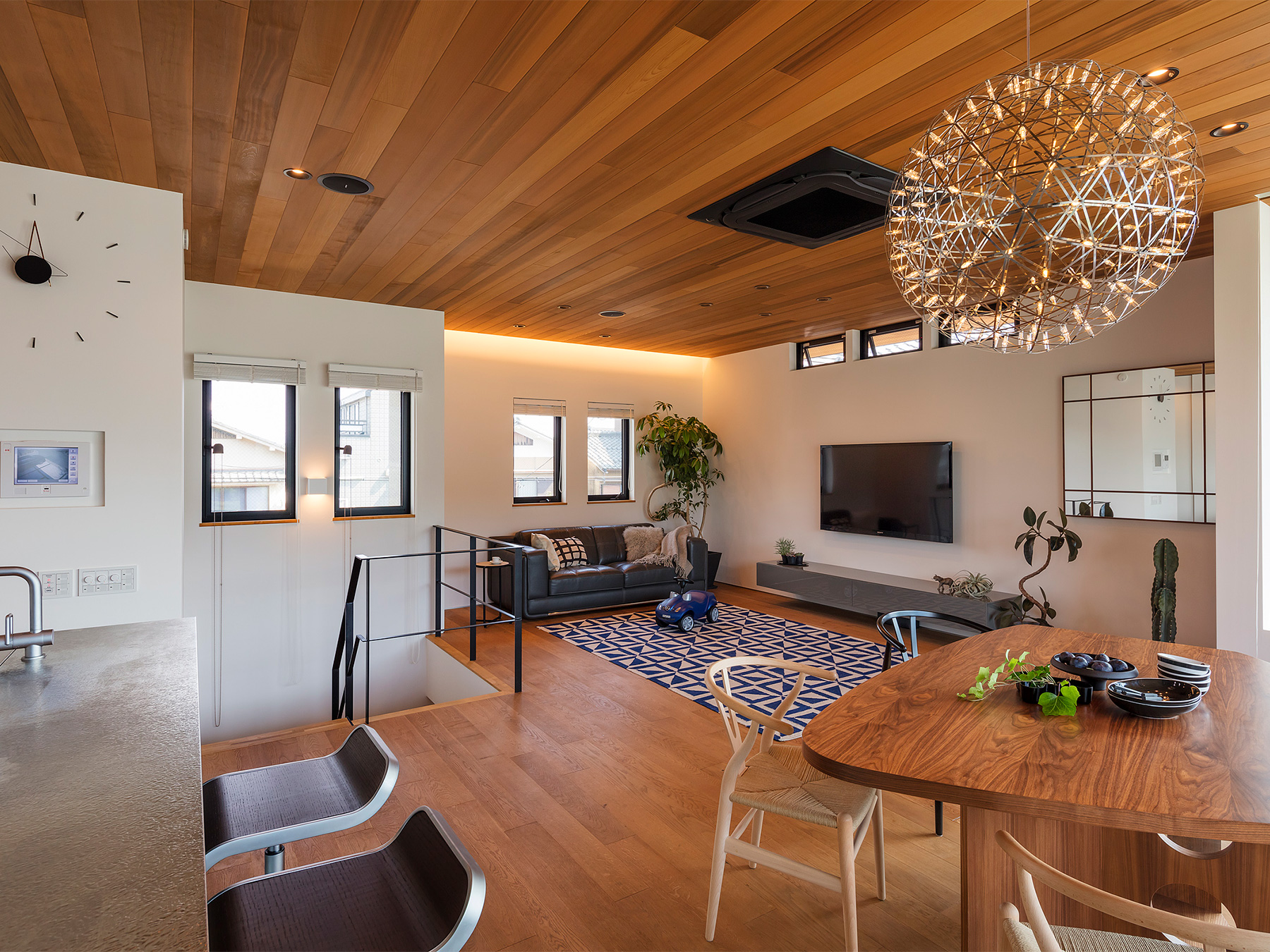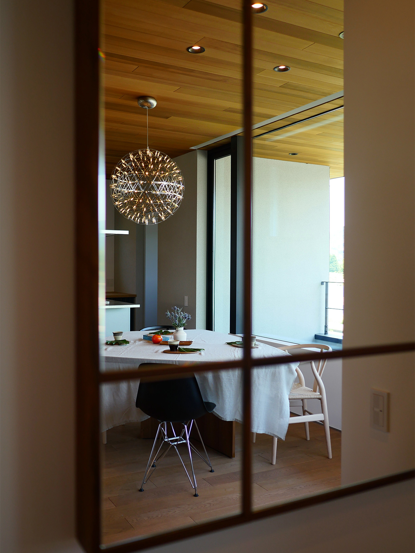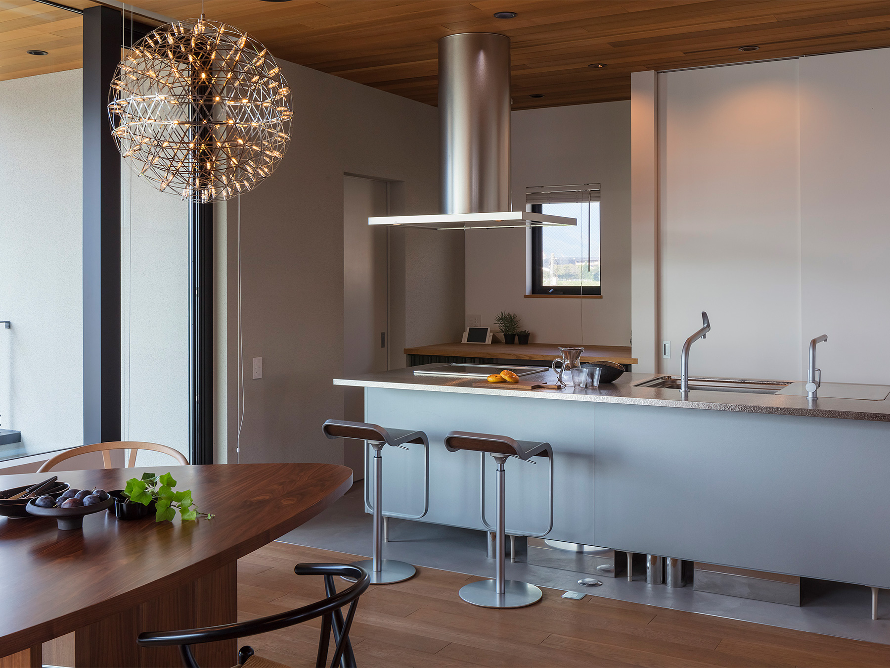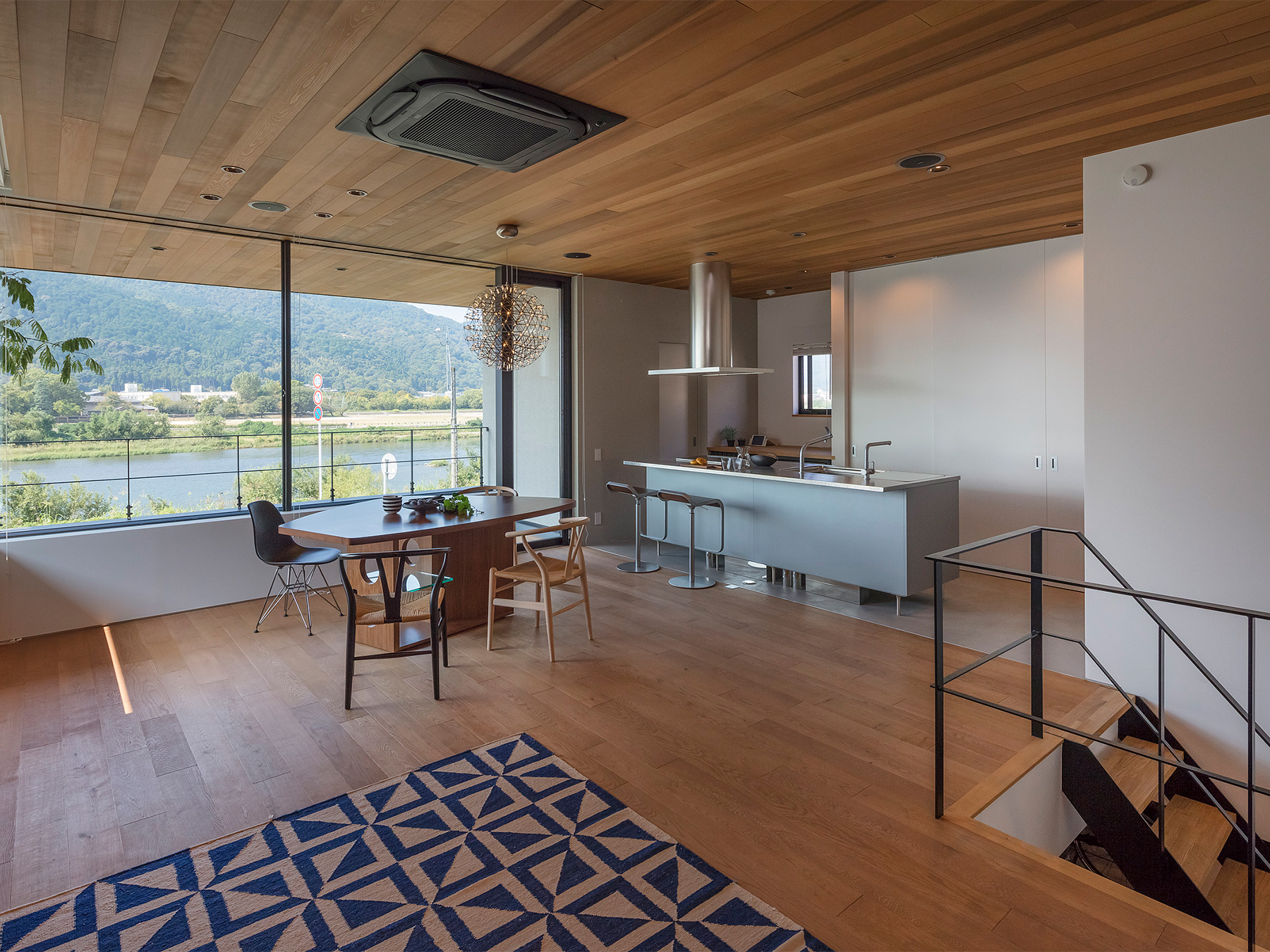 京都嵐山の絶景を存分に楽しめる「嵯峨の家」。立地のよさを最大限に引き出すために、生活の中心を2階にして、間仕切りのない開放的で明るいLDKに仕上げました。壁一面に広がる窓がこちらの住まいの最大の魅力。窓枠の仕様に美術館の設計を参考にするなど、一般的な木造住宅の概念にとらわれないダイナミックかつ繊細な設計で、家の中にハレとケのメリハリがある空間ができました。
