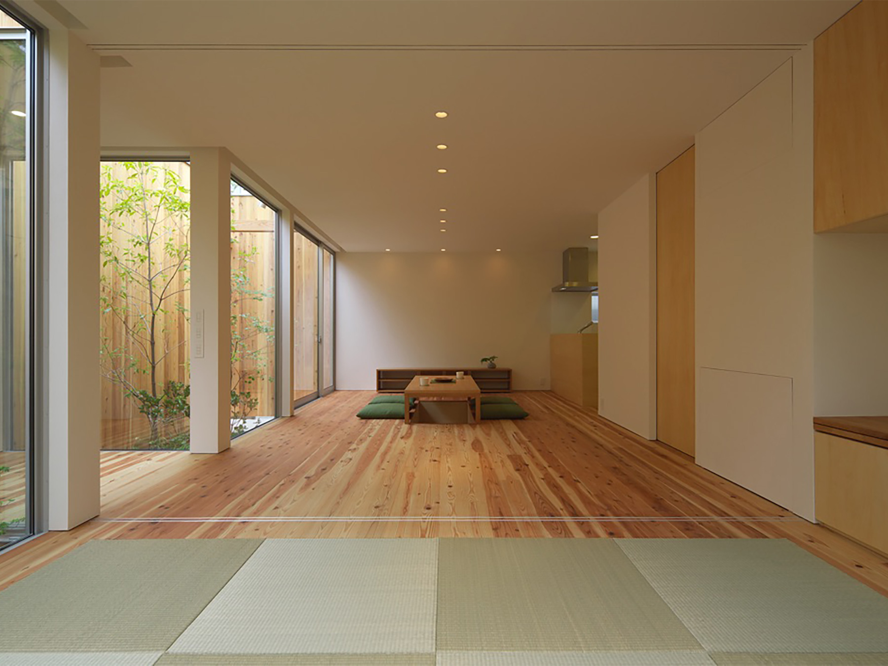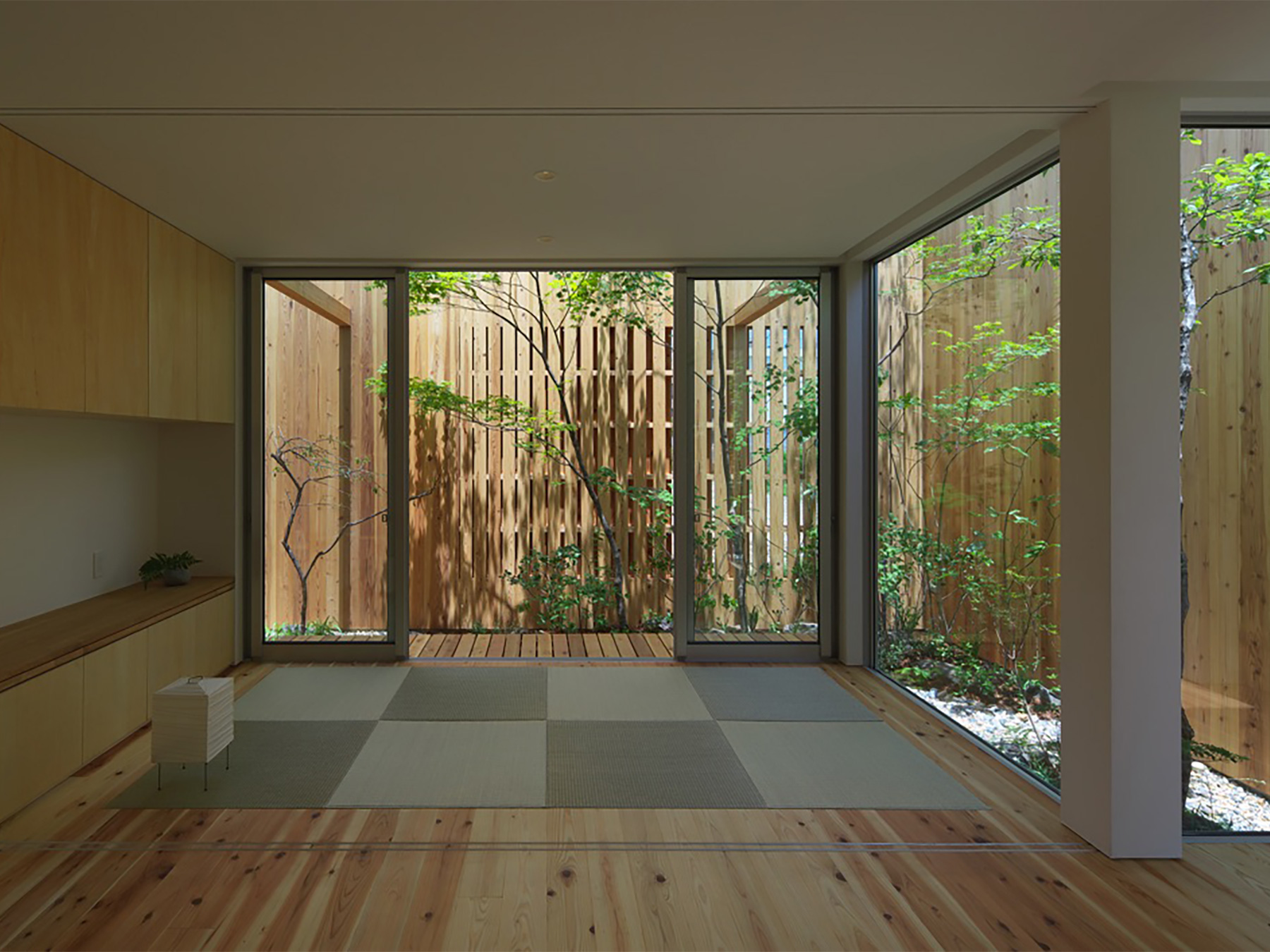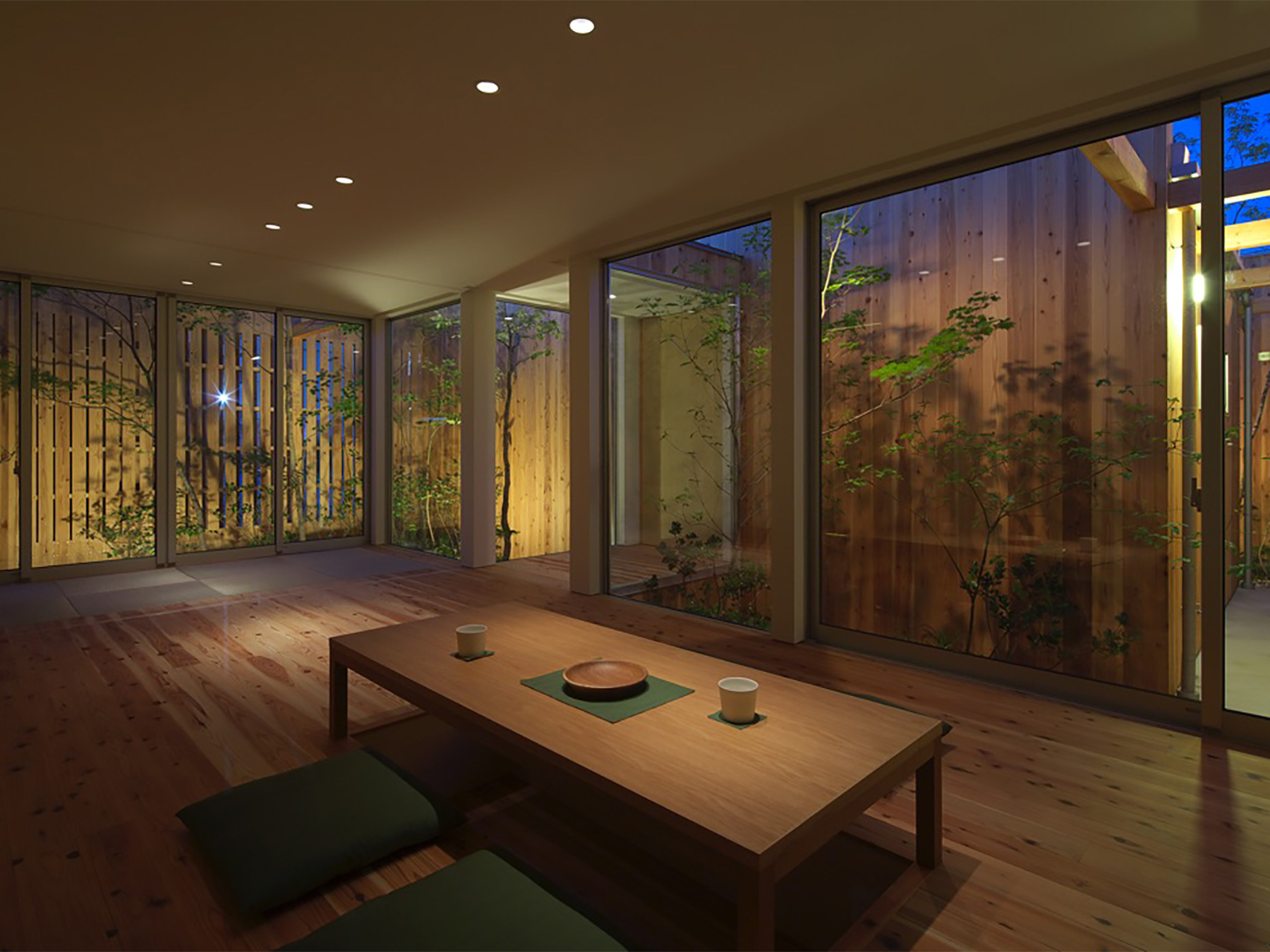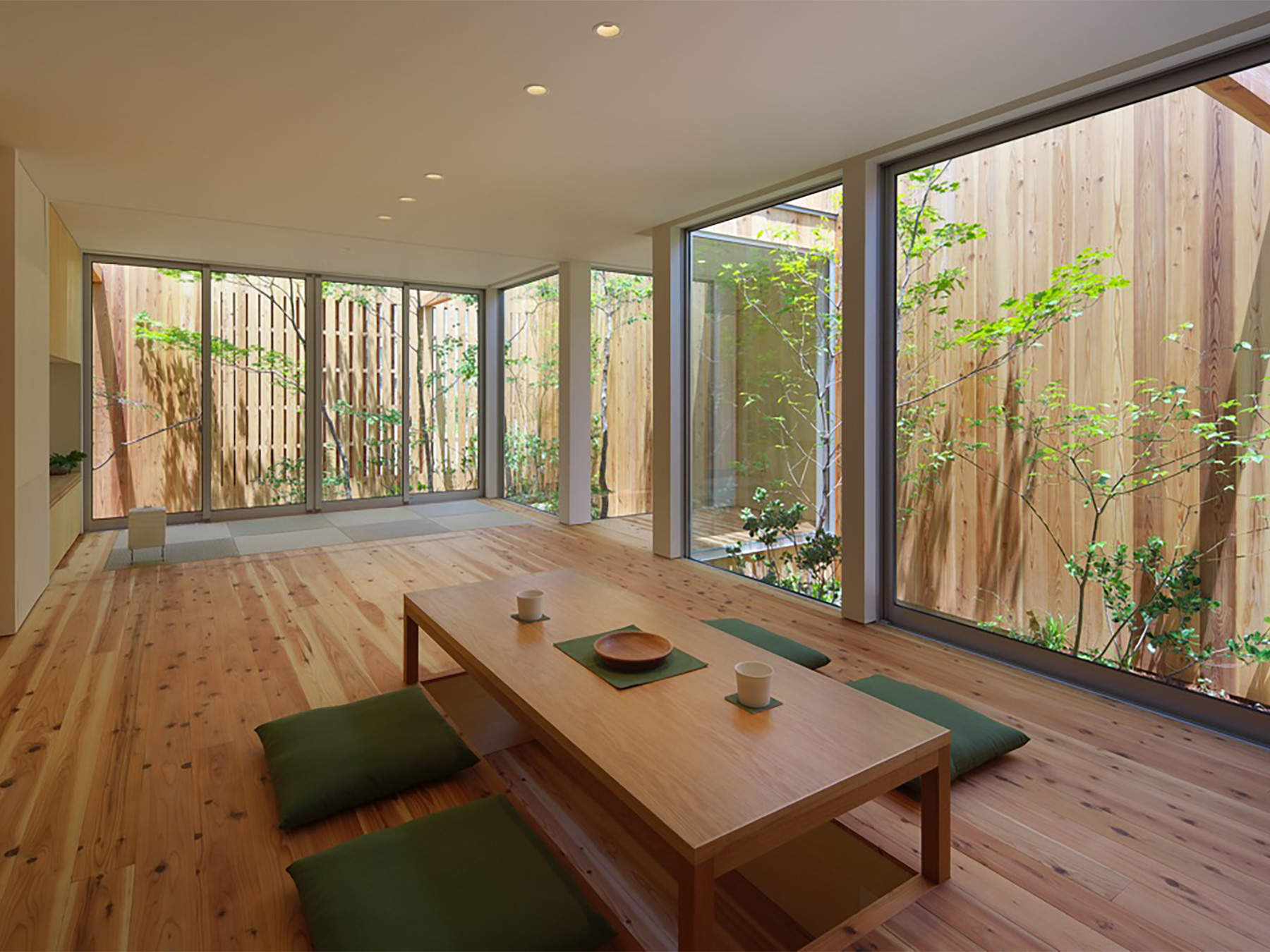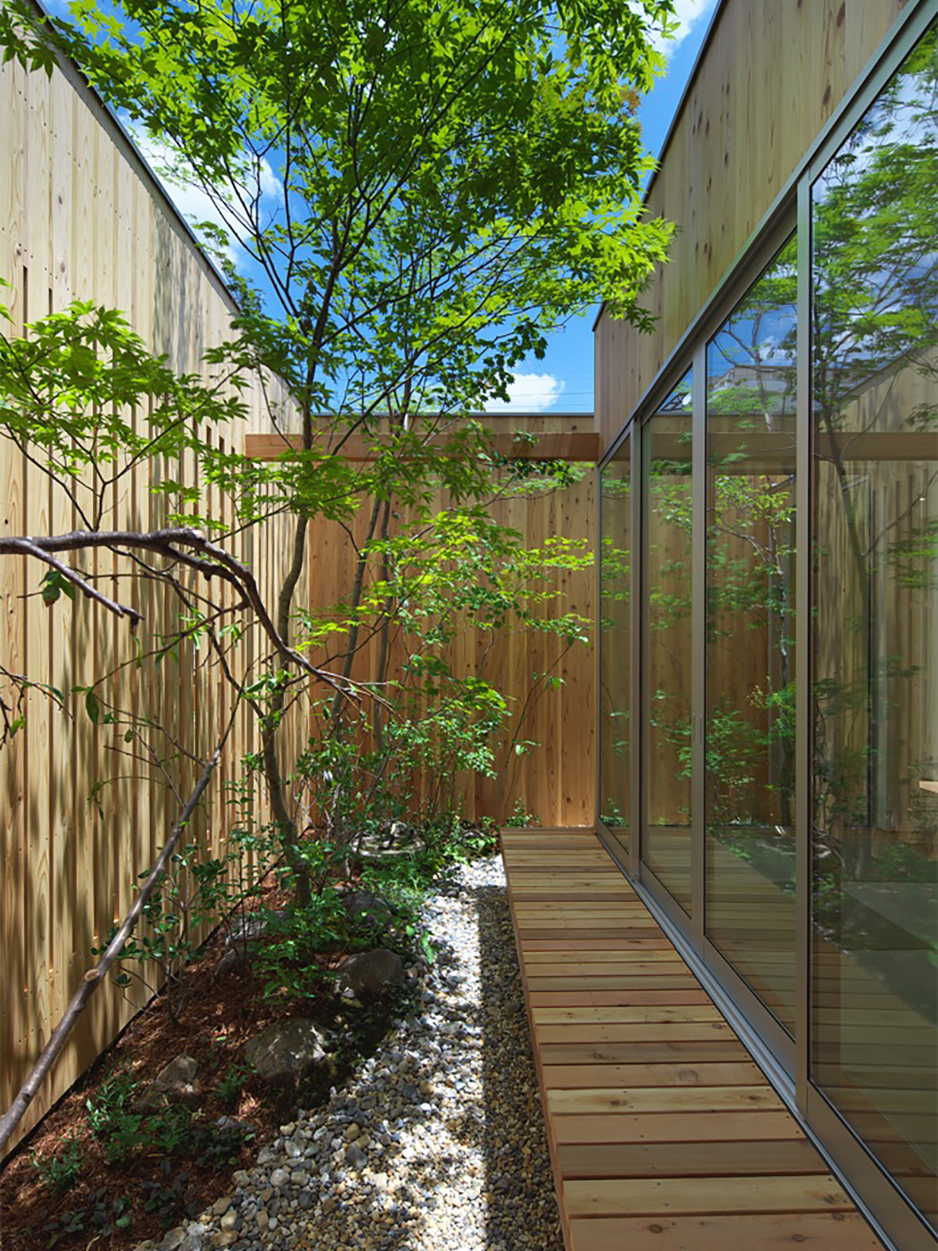 定年を迎えられたご夫婦がゆったりと時を過ごすための、平屋建ての住まいです。総板張りの外壁は工事中でも大変人目を惹き、道行く人に「何かお店ができるの?」と聞かれたほどでした。この壁の向こう側には随所に庭が配されていて、家のあらゆる場所から木々の緑を見ることができます。町中に在りながら人目を気にすることなく、降りそそぐ陽の光や板塀に映る木々の陰影を眺めて過ごす…生活空間そのものはコンパクトでありながら、とてもゆったりと贅沢な空間になりました。