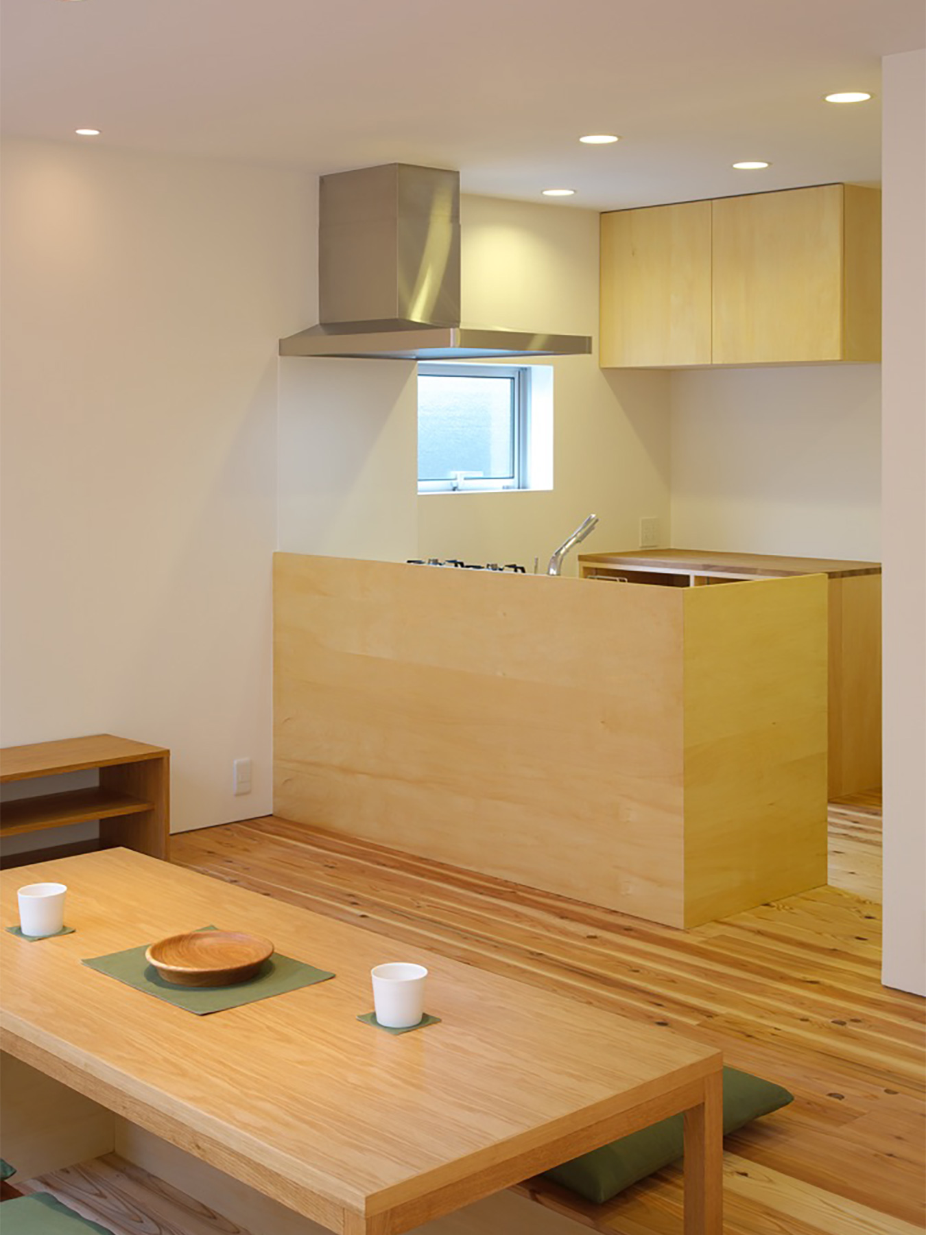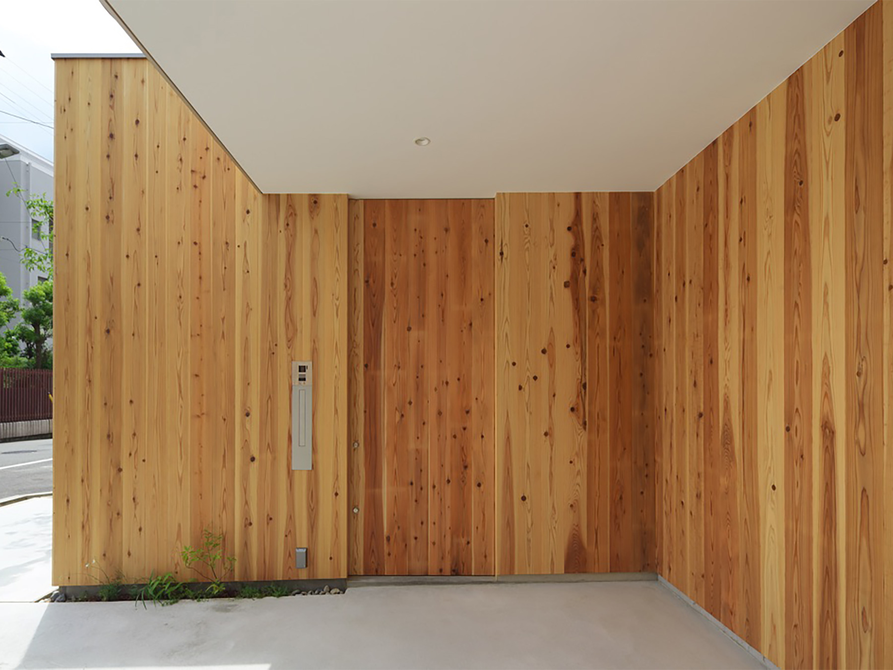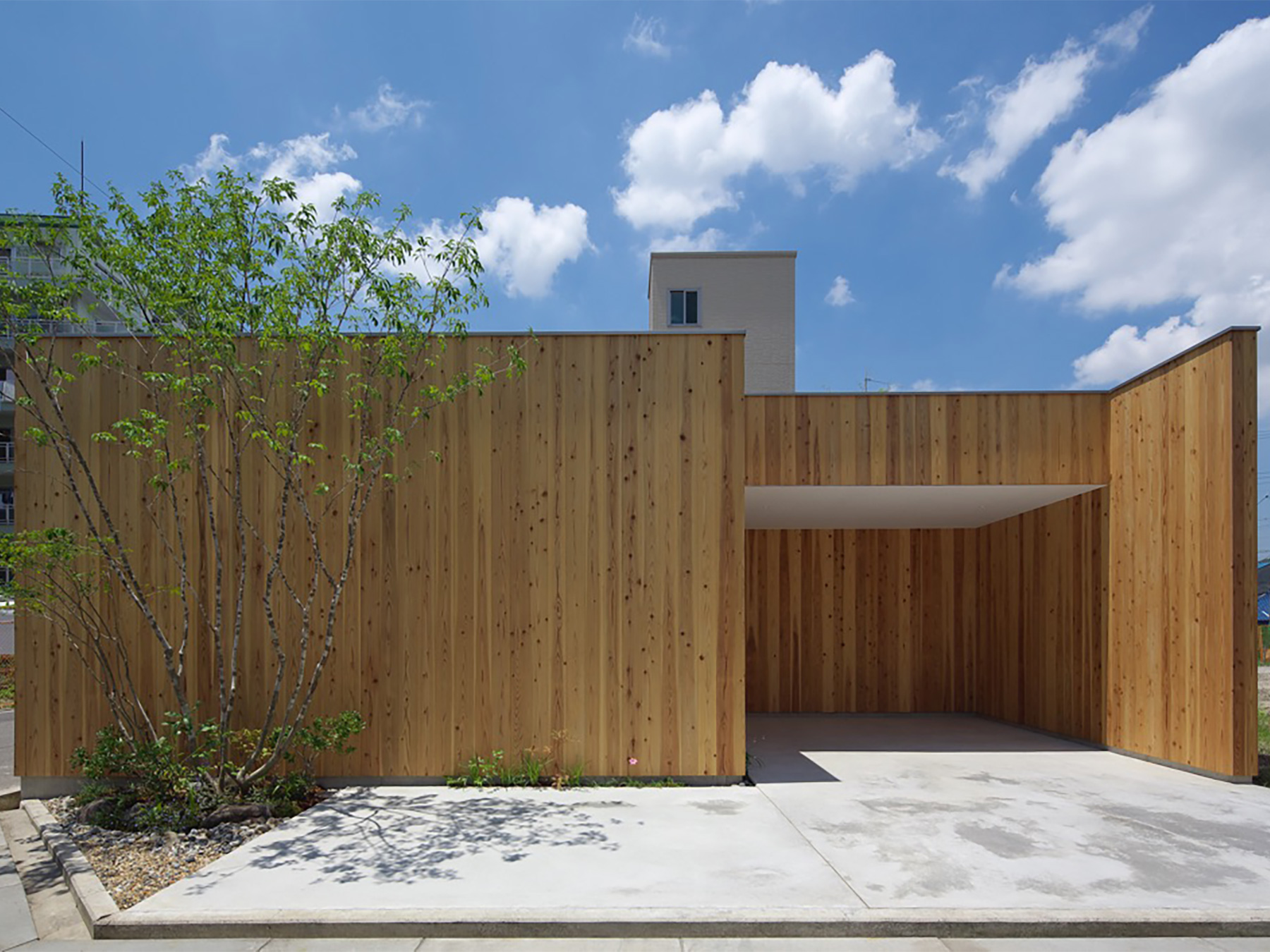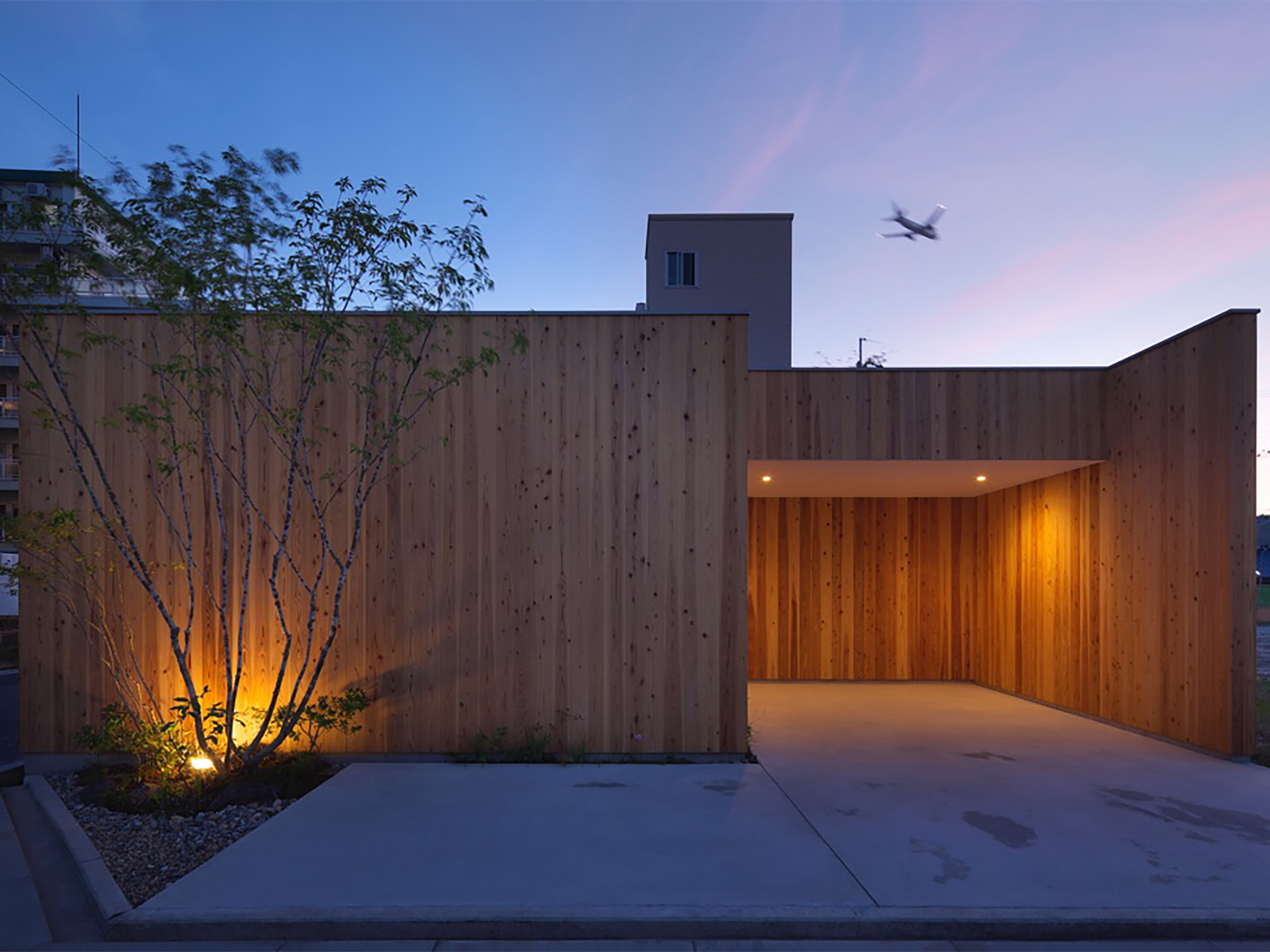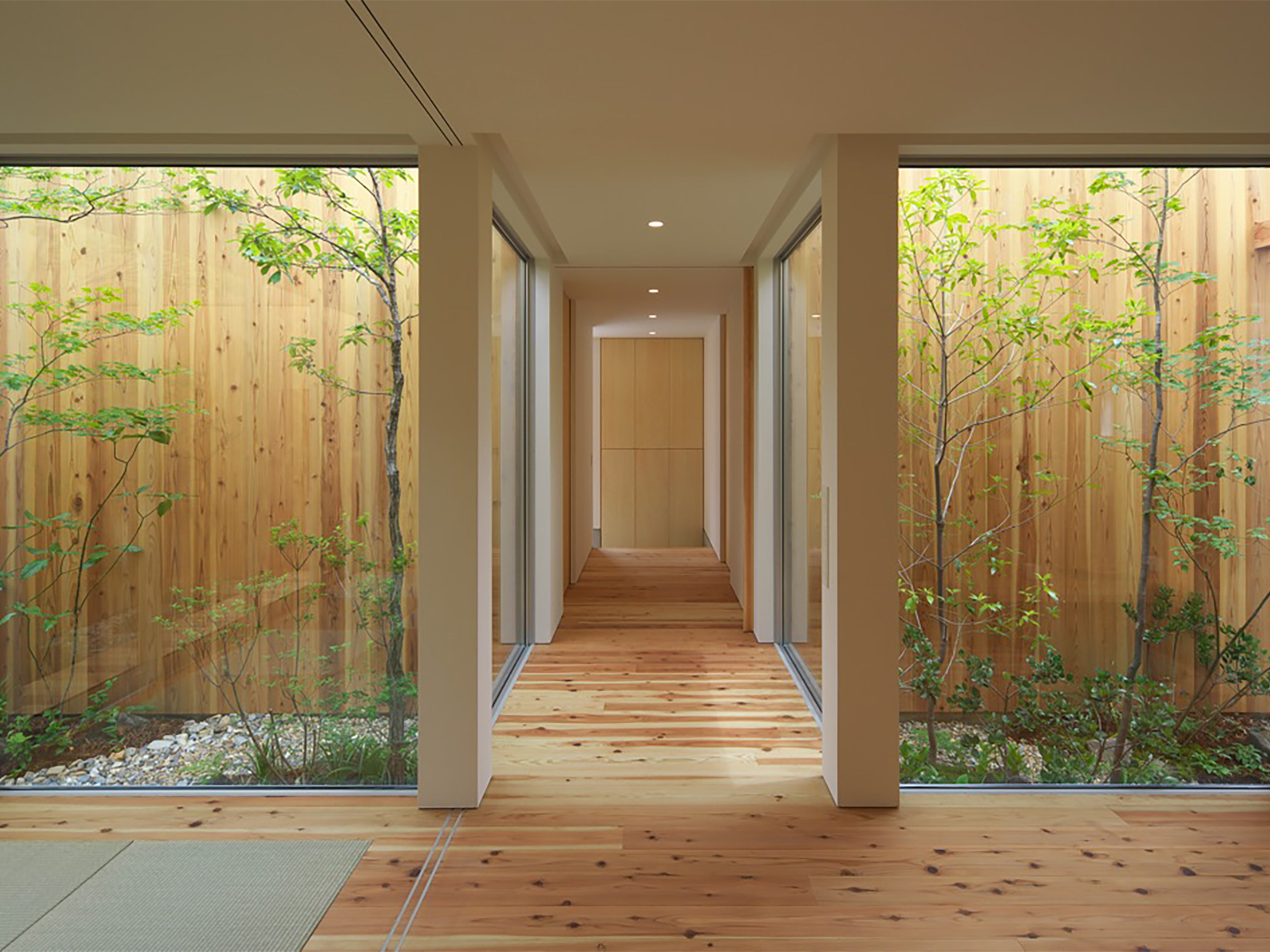 定年を迎えられたご夫婦がゆったりと時を過ごすための、平屋建ての住まいです。総板張りの外壁は工事中でも大変人目を惹き、道行く人に「何かお店ができるの?」と聞かれたほどでした。この壁の向こう側には随所に庭が配されていて、家のあらゆる場所から木々の緑を見ることができます。町中に在りながら人目を気にすることなく、降りそそぐ陽の光や板塀に映る木々の陰影を眺めて過ごす…生活空間そのものはコンパクトでありながら、とてもゆったりと贅沢な空間になりました。