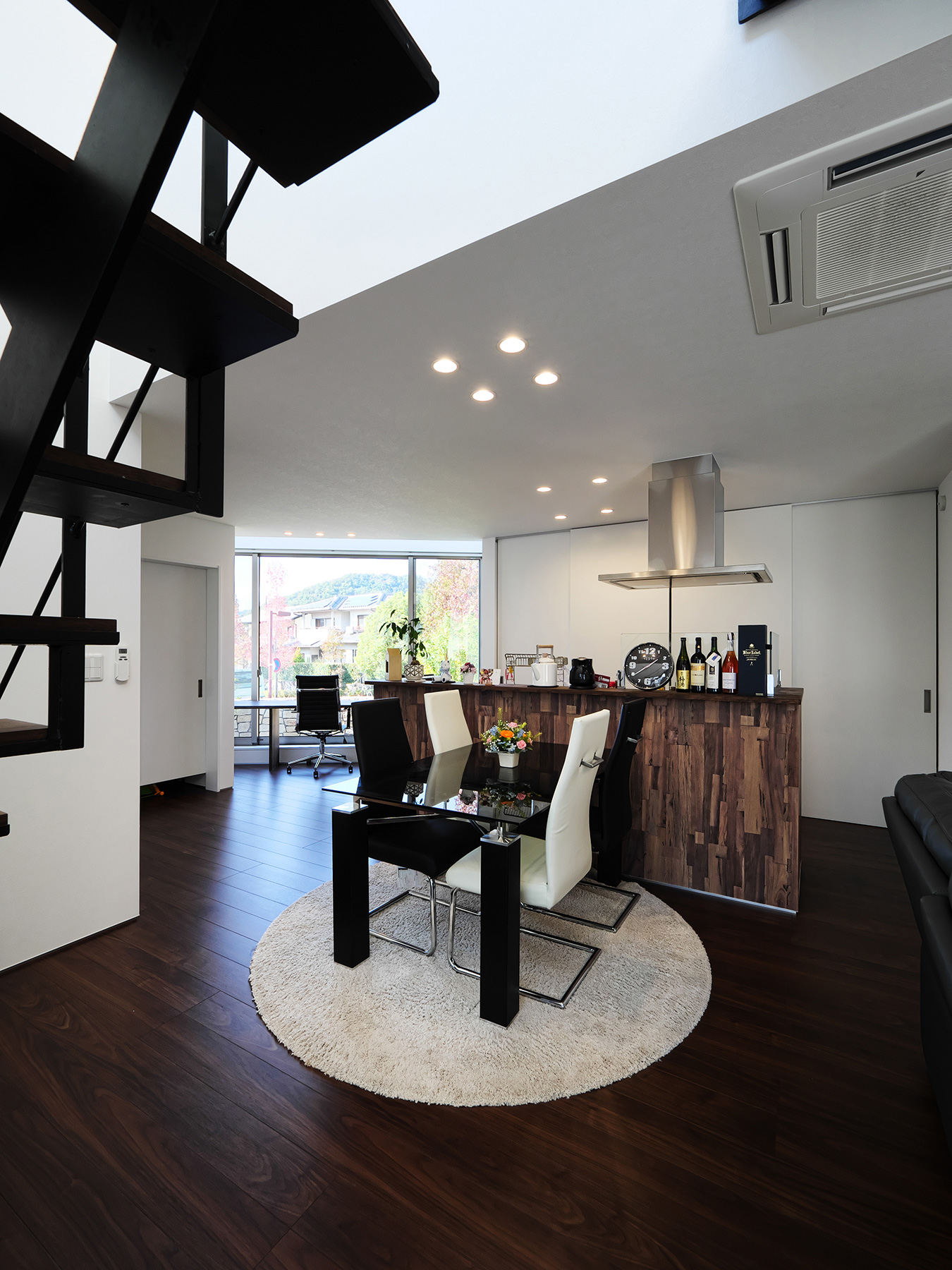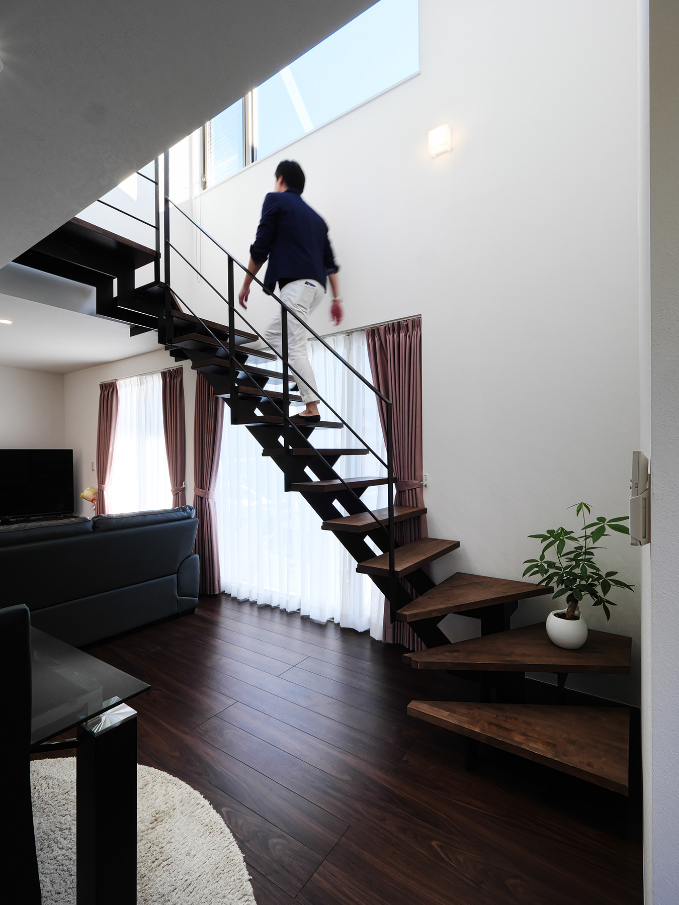 LDKと吹き抜けスペースを繋ぐのは、インテリアの一部として「見せる」階段。スチールと無垢材のスケルトン階段なので、吹き抜けから入り込む光を遮らず、機能性とデザイン性を両立しています。