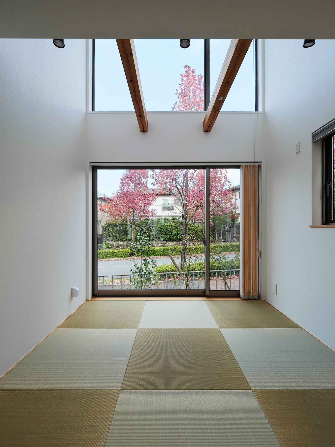 さらにLDKに併設された和室も吹き抜けに。上下に大きな窓を付け、街路樹を一望できるなど、自然との一体感を得らるのがポイントです。和室の吹き抜けにはSE構法の梁を露出させ、デザインのアクセントになっています。