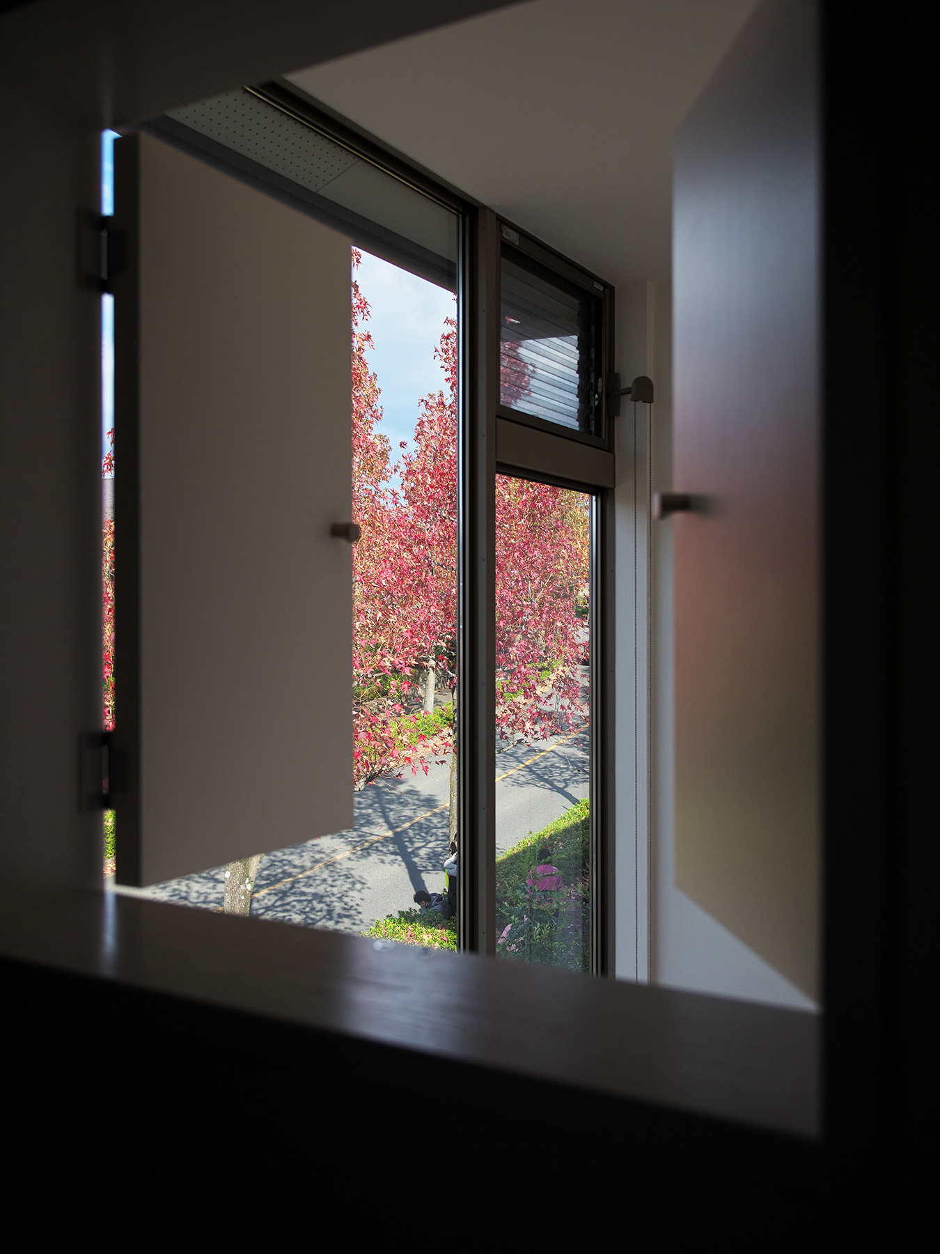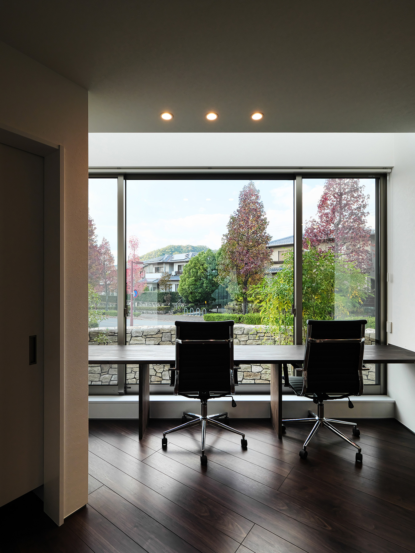 坂道の高低差のある地形を活かして、家の中から様々な角度で自然を眺められるような設計となりました。