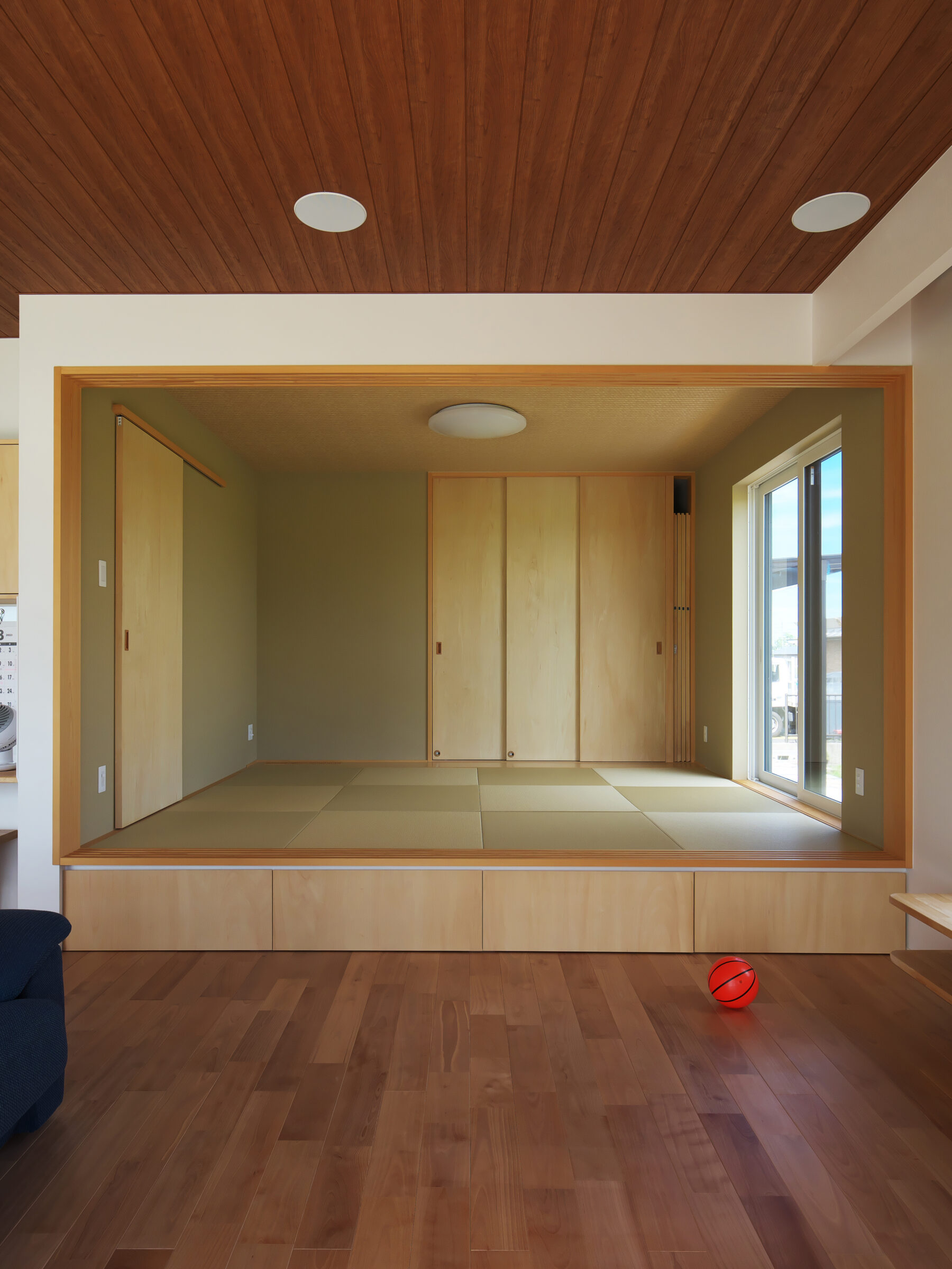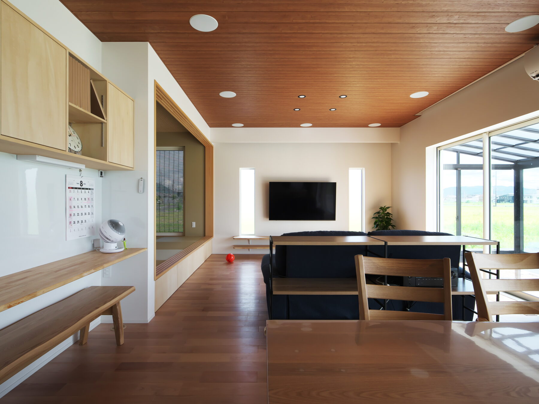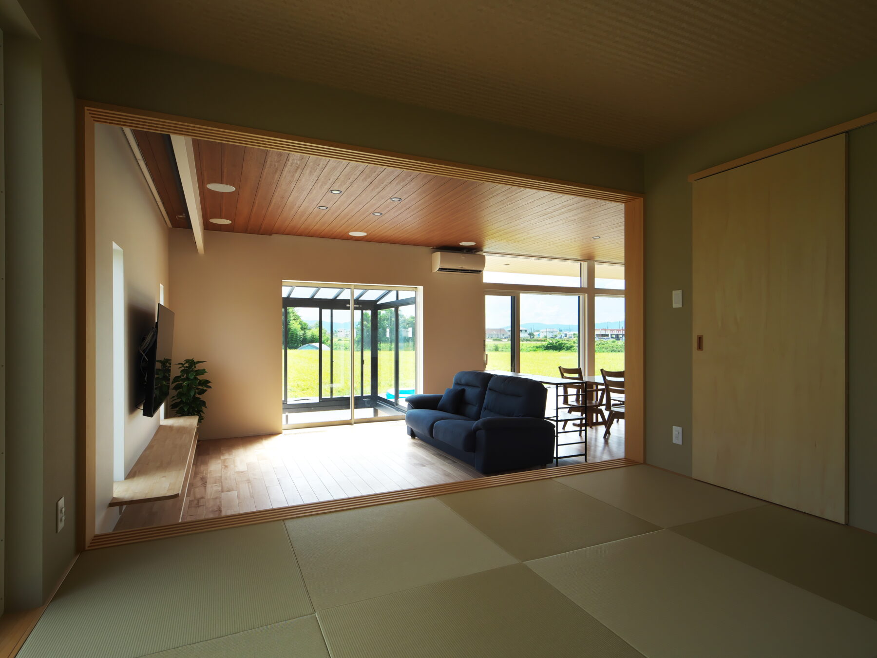 床下エアコン「澄家」を施工。周りの風景を活かすよう大開口を設けながら、機密も追及しました。ドアの上部は空気が流動するようにしてあります。和室には掘りごたつと床下収納を備えています。 機密性能 ・C値:0.3㎠/㎡ ・n値:1.57 ・ACH:0.5回/h