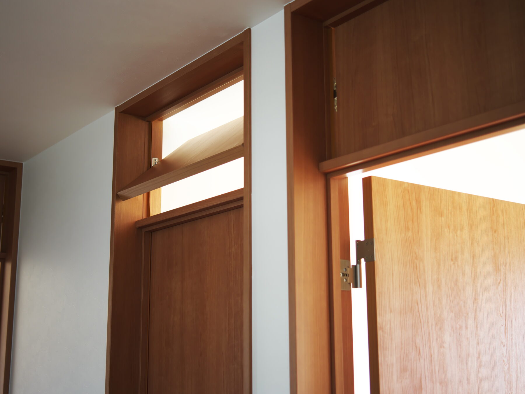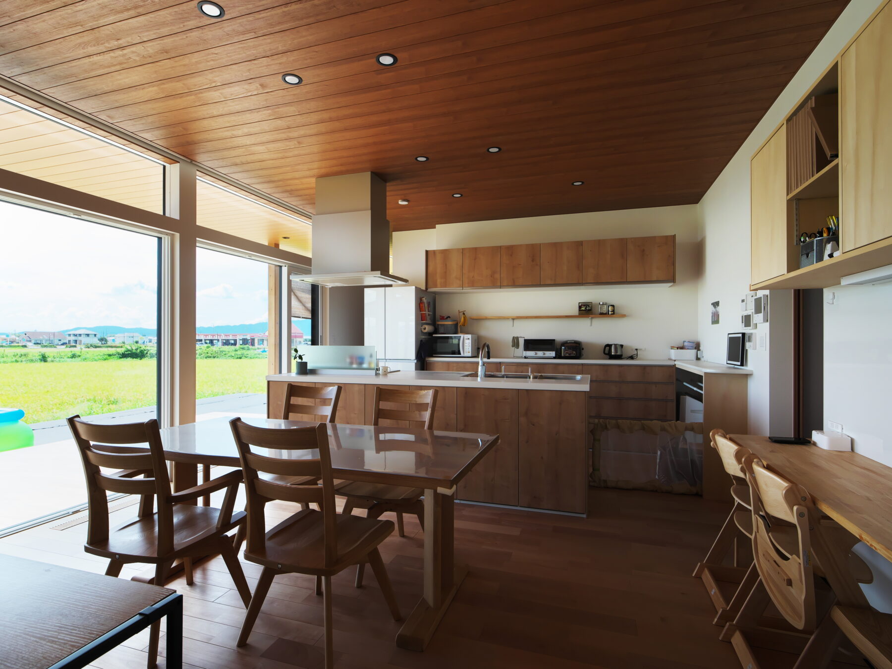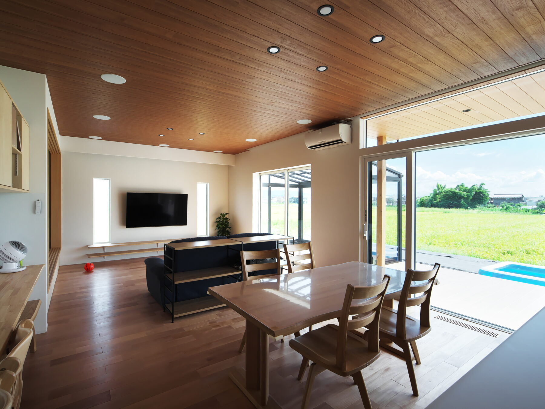 床下エアコン「澄家」を施工。周りの風景を活かすよう大開口を設けながら、機密も追及しました。ドアの上部は空気が流動するようにしてあります。和室には掘りごたつと床下収納を備えています。 機密性能 ・C値:0.3㎠/㎡ ・n値:1.57 ・ACH:0.5回/h