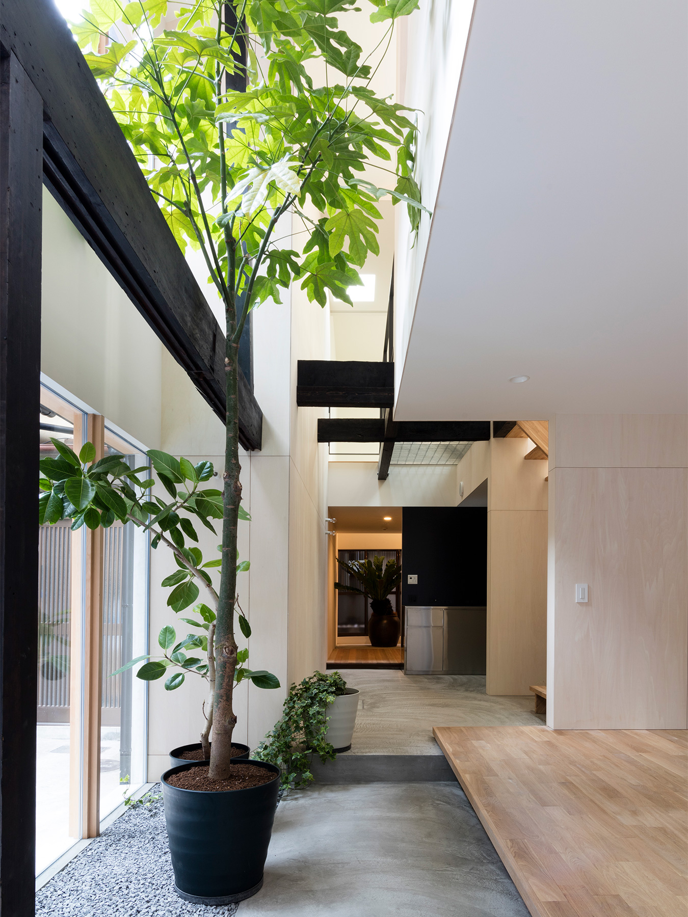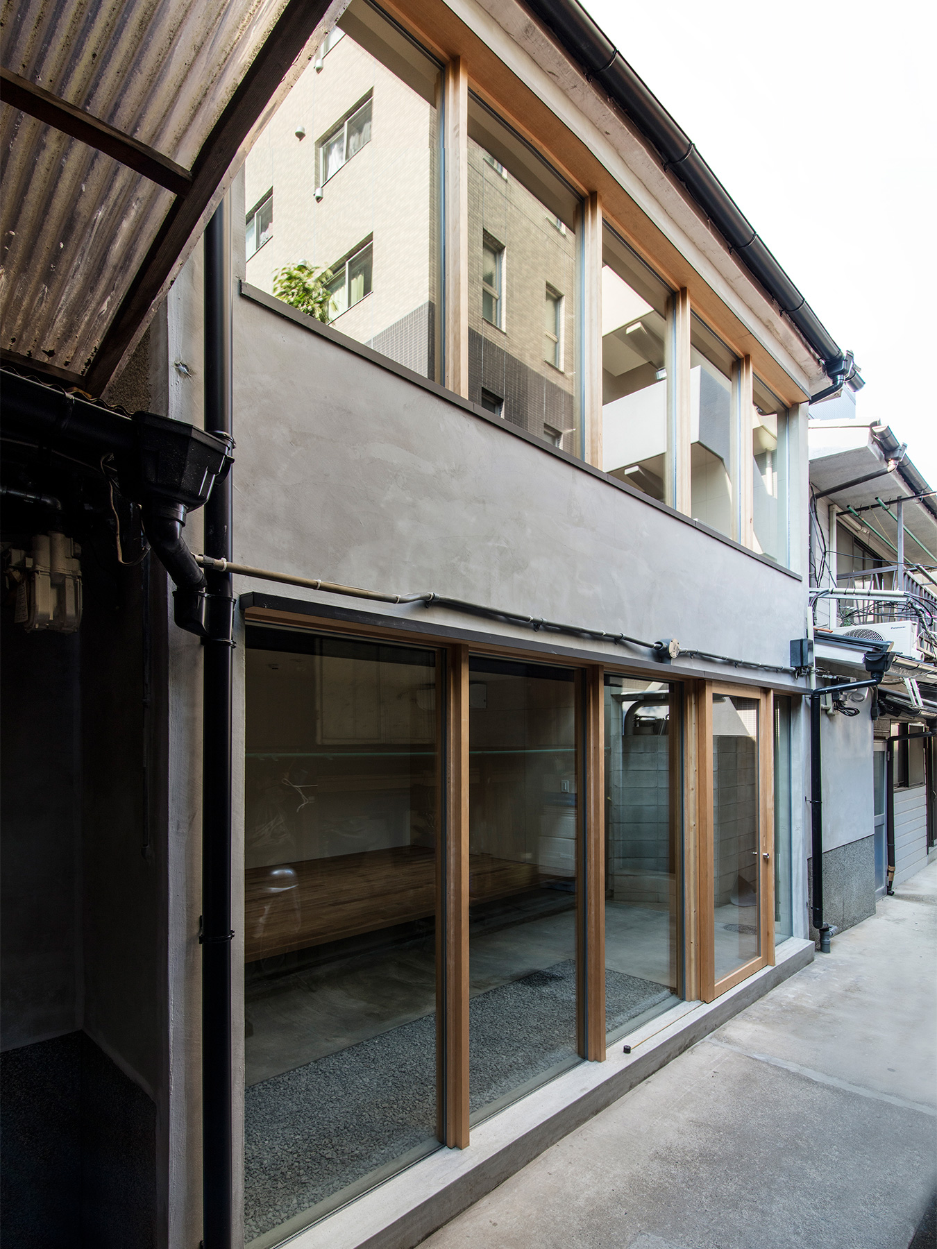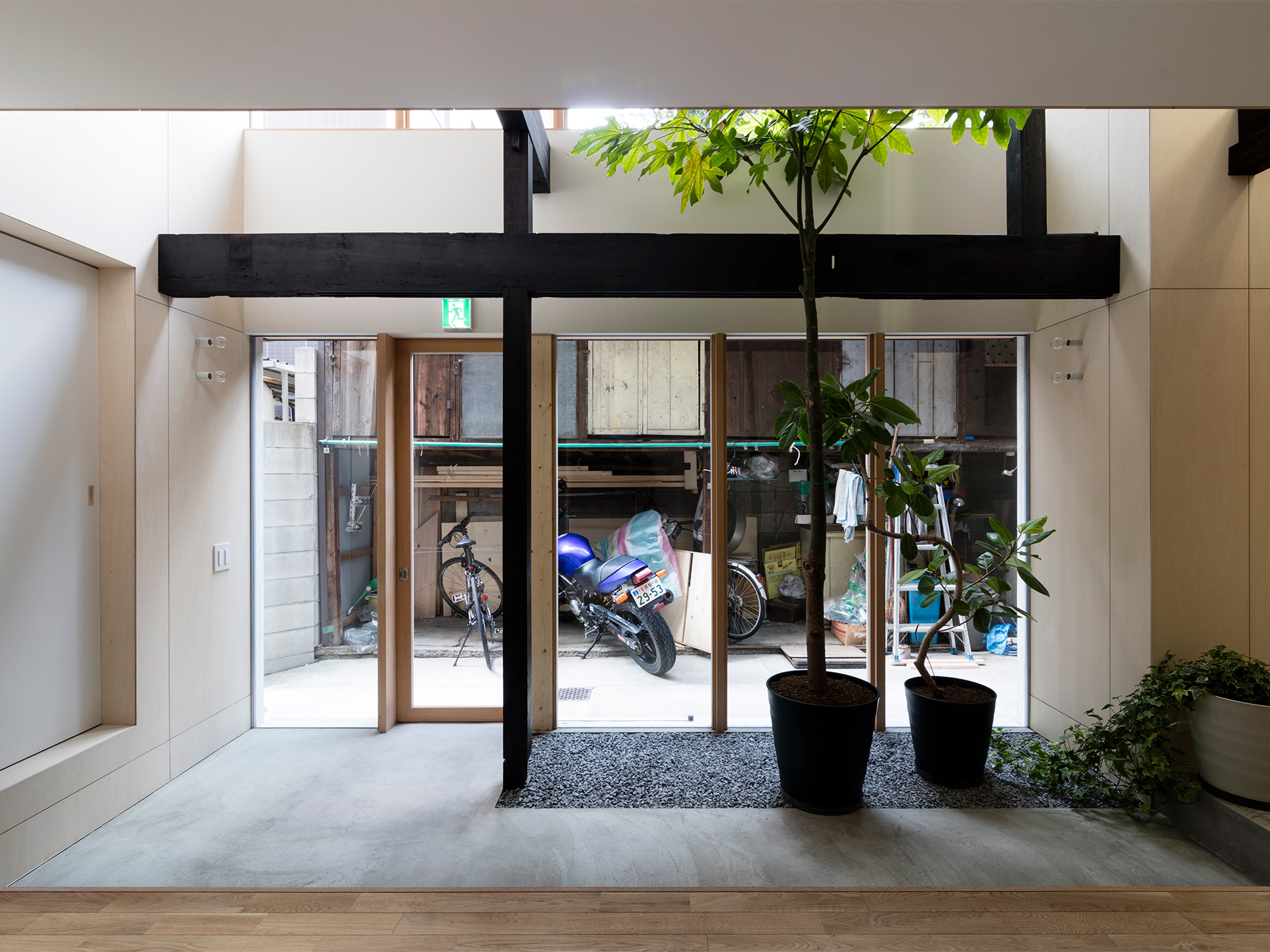 京町家をゲストハウスにした物件のリノベーション。 外観は和風の趣を残しつつ、モダンでシンプルな内装はまさに「リ・町家」のコンセプトを反映した町家の再生となりました。 ゲストハウスらしくお客様が気軽に出入りできる開放的なエントランスは、日本家屋においてかつて外と内を繋いだ土間空間の現代的な解釈です。